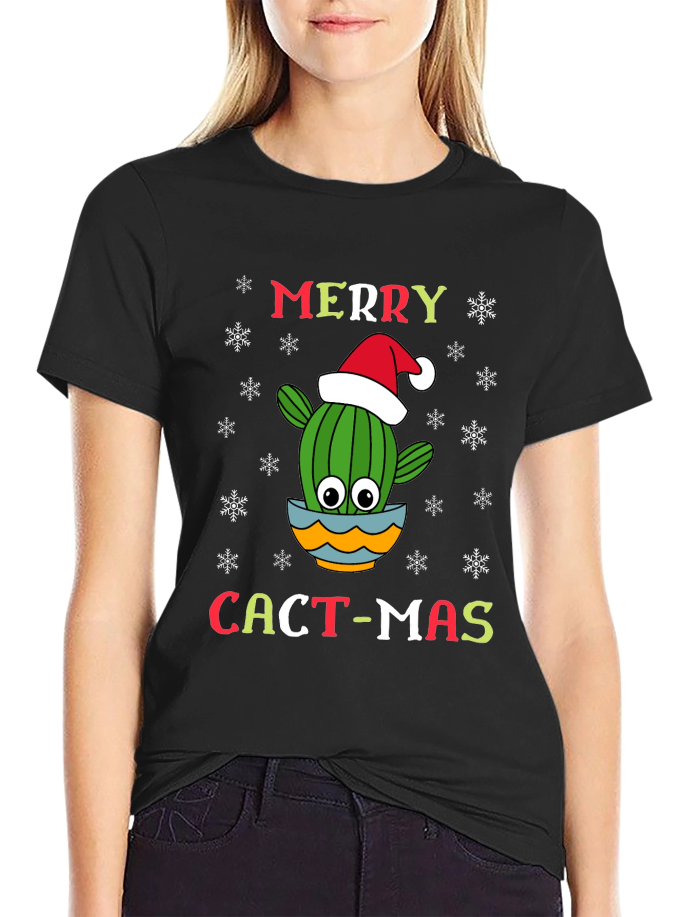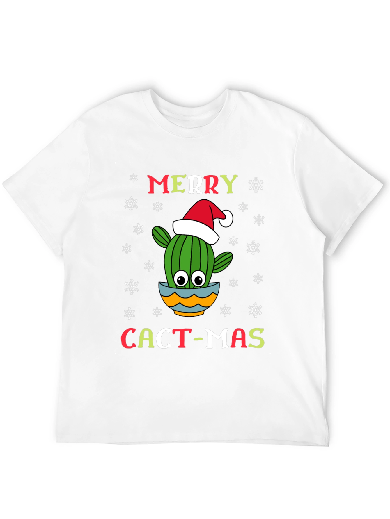 Get into the holiday spirit with this festive "Merry Cact-mas" t-shirt. The shirt features a cartoon cactus wearing a Santa hat, playfully nestled in a colorful pot. Snowflakes surround the lettering. This tee is perfect for those with a unique sense of humor or who simply love cacti. The t-shirt appears to be made from a soft and comfortable material, ensuring a cozy fit during the colder months. Wear it to your next holiday party, family gathering, or even just while lounging around the house. This shirt is sure to bring a smile to everyone's face!