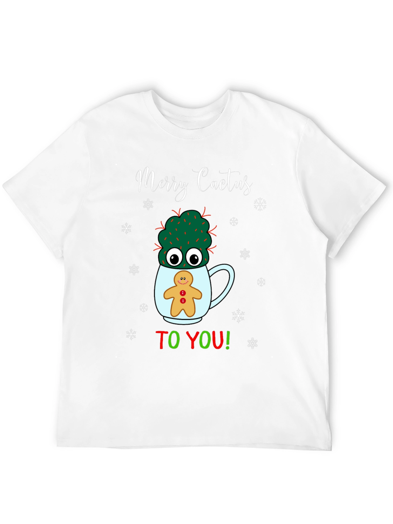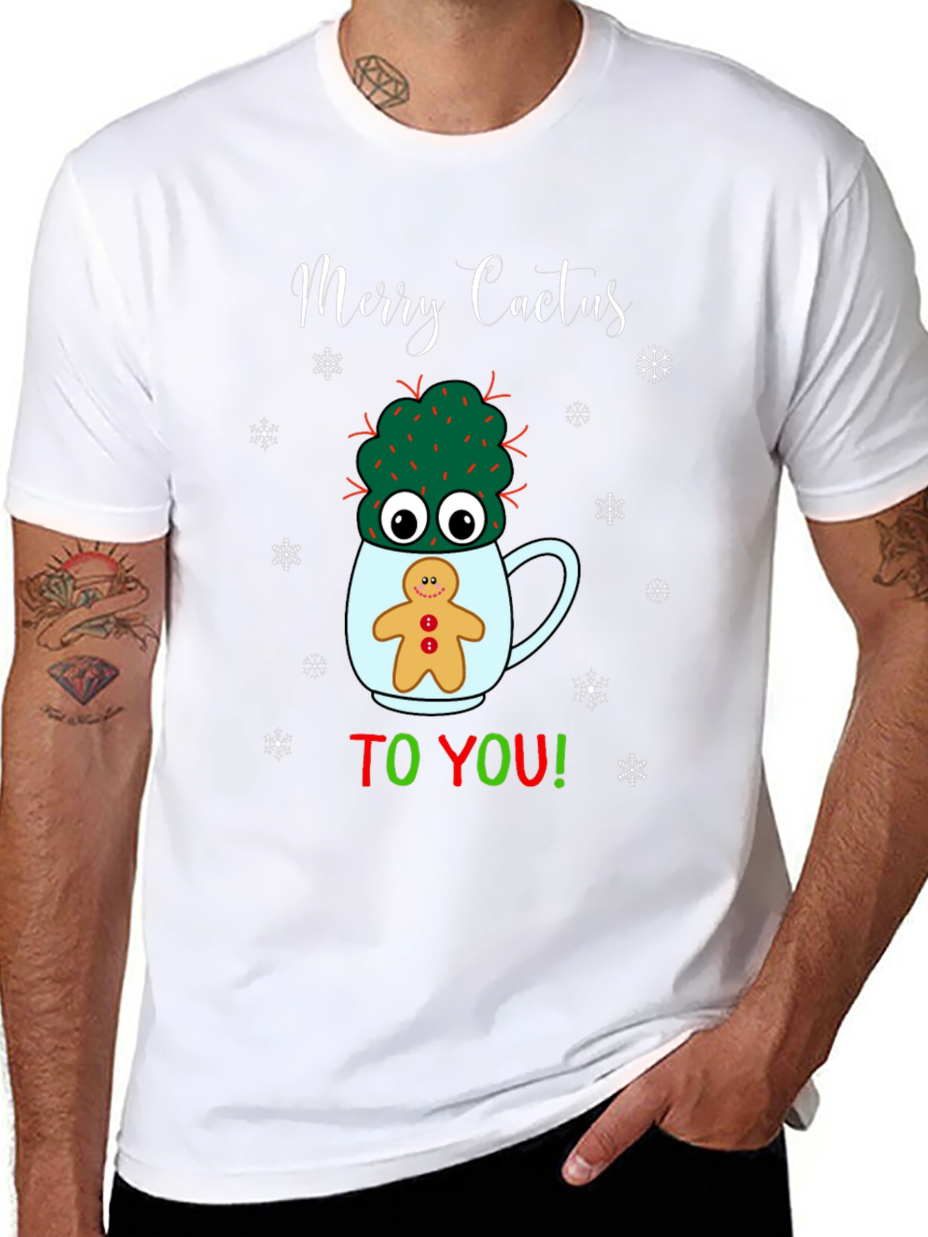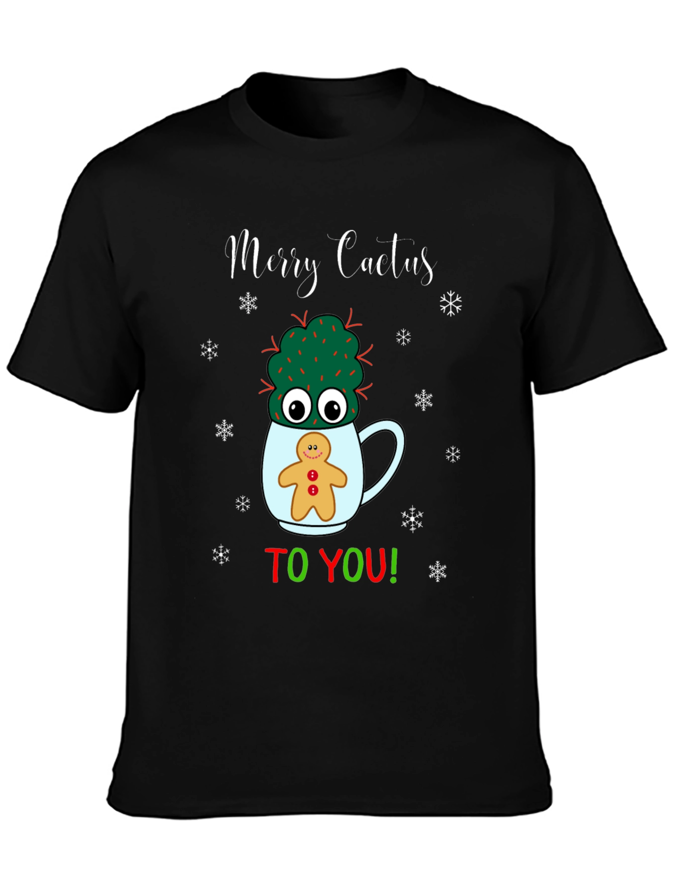 Spread holiday cheer with this fun "Merry Cactus To You!" graphic t-shirt. The design features a cute cartoon cactus in a mug with a gingerbread man, surrounded by snowflakes. This unique Christmas tee is perfect for those with a quirky sense of humor, or who love cacti. Made from a comfortable, soft fabric, it's ideal for wearing to holiday parties, casual gatherings, or simply lounging around during the festive season. A perfect Christmas gift for family, friends, or yourself!