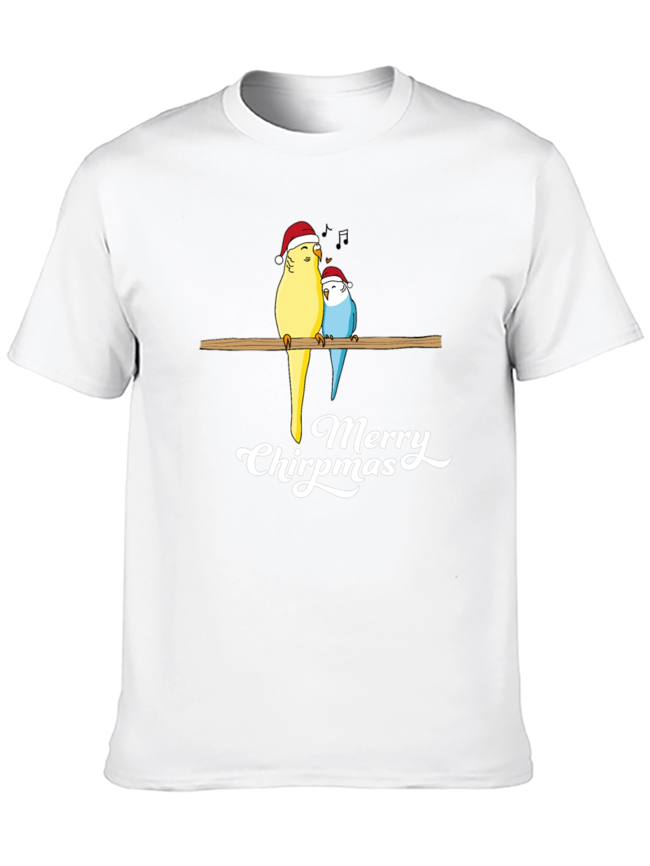Spread some holiday cheer with this unique "Merry Chirpmas" graphic tee! The black shirt features two adorable cartoon parrots wearing Santa hats, perched on a branch with festive music notes floating above. The playful design is printed in crisp white, making it pop against the black background. Made from a soft, breathable fabric, this tee is comfortable for everyday wear and perfect for holiday gatherings, casual outings, or cozy nights at home. Show off your love for birds and Christmas with this eye-catching and fun shirt! Available in various sizes.