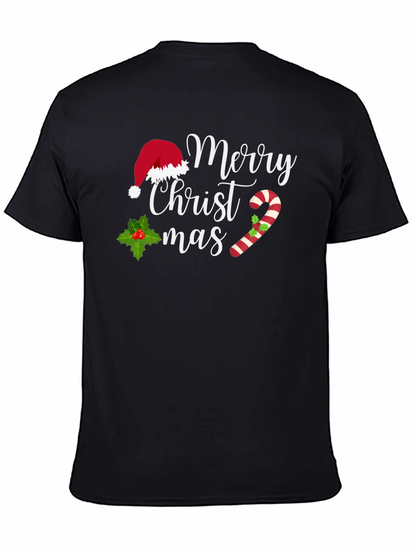 Celebrate the festive season with this fun "Merry Christ-mas" T-shirt! This black T-shirt features a playful design incorporating classic Christmas elements such as a Santa hat, holly, and a candy cane. The white text contrasts beautifully against the black background, making the design pop. Made from a comfortable material, this shirt is perfect for holiday parties, family gatherings, or just spreading some Christmas cheer. Pair it with your favorite jeans or leggings for a casual, festive look. Get yours now and spread the holiday spirit!
