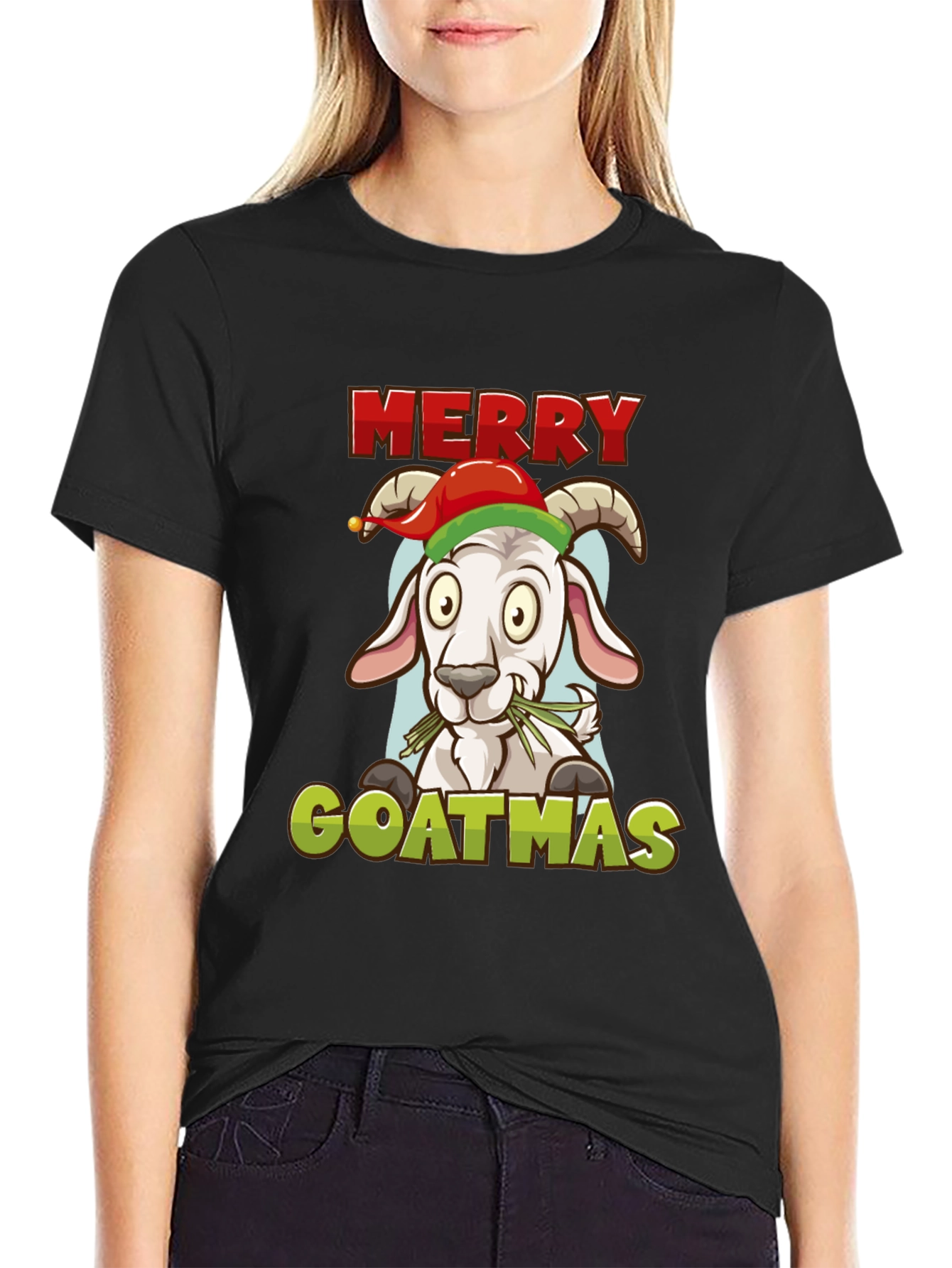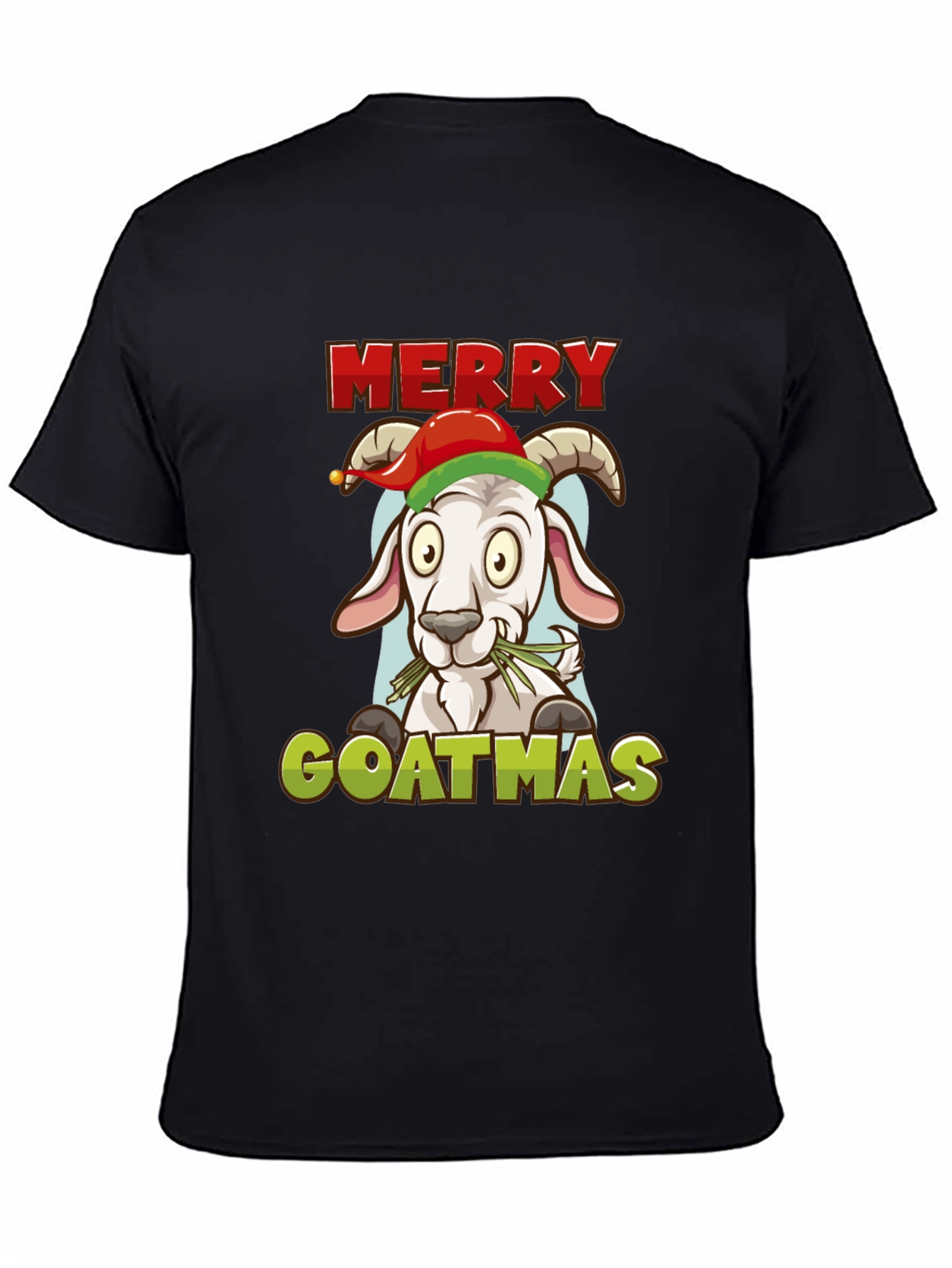 Spread some holiday cheer with this fun and festive "Merry Goatmas" t-shirt. The tee features a cute cartoon goat wearing a Santa hat, adding a playful twist to the traditional Christmas theme. "Merry" is shown above the goat, in red block letters with a white outline, and "Goatmas" below, in green block letters with a white outline. Made from a soft, breathable fabric, this shirt is comfortable to wear all day long. The black background makes the colorful design pop, ensuring you'll stand out at any holiday gathering. Perfect for goat lovers and anyone with a sense of humor, this t-shirt makes a great gift and is sure to bring smiles during the Christmas season.