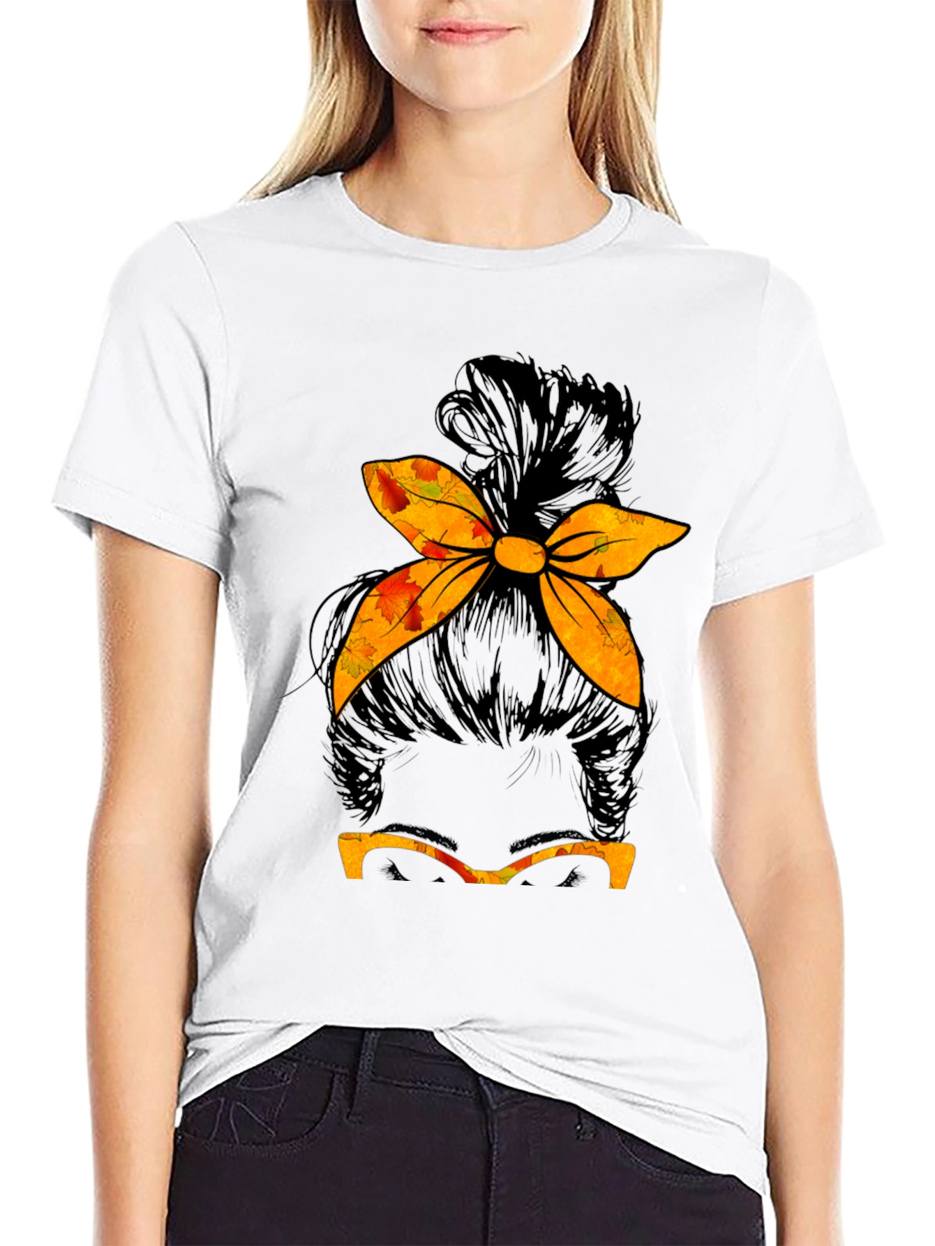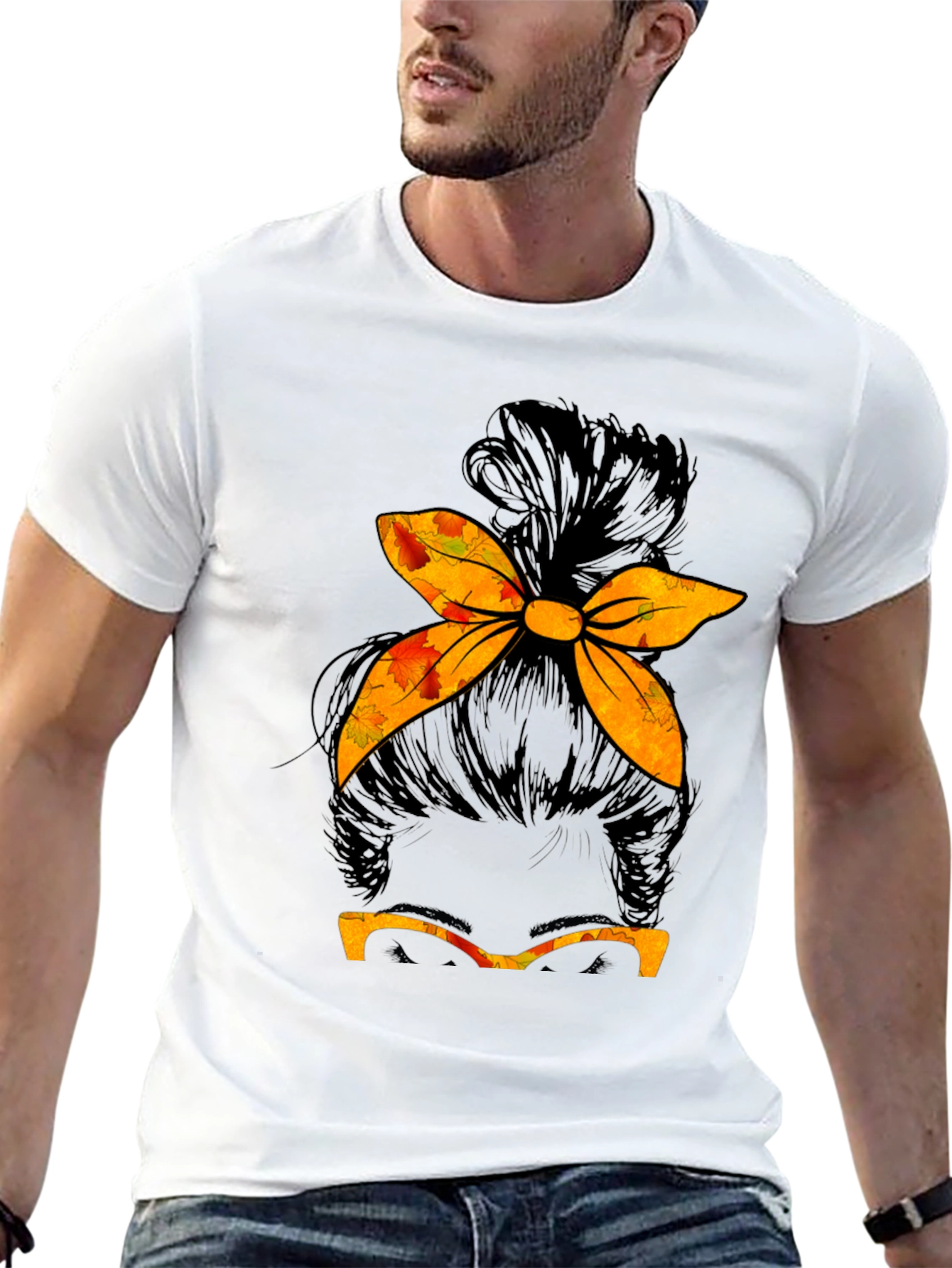 Embrace autumn vibes with this trendy black t-shirt. Featuring a playful graphic of a messy bun adorned with a vibrant, fall-themed bandana and stylish glasses, this shirt is perfect for Thanksgiving gatherings, pumpkin spice runs, or cozy days spent enjoying the season. The design captures the essence of autumn with its rich colors and whimsical charm. Made from a soft and comfortable fabric, this t-shirt is as enjoyable to wear as it is stylish. Pair it with jeans or leggings for a casual, effortlessly chic look that celebrates the beauty of fall. Ideal for those who love the messy bun look and embrace the spirit of Thanksgiving.
