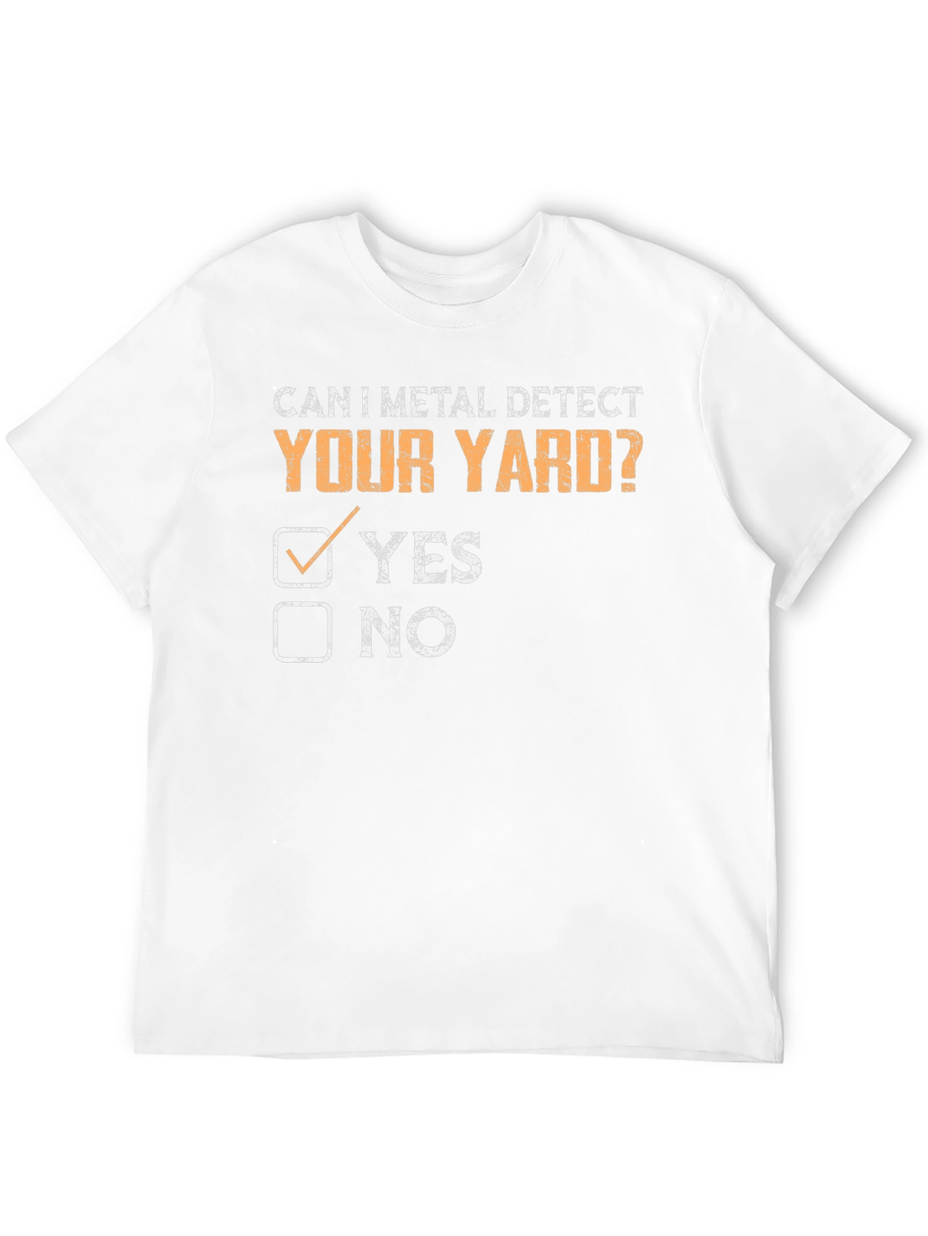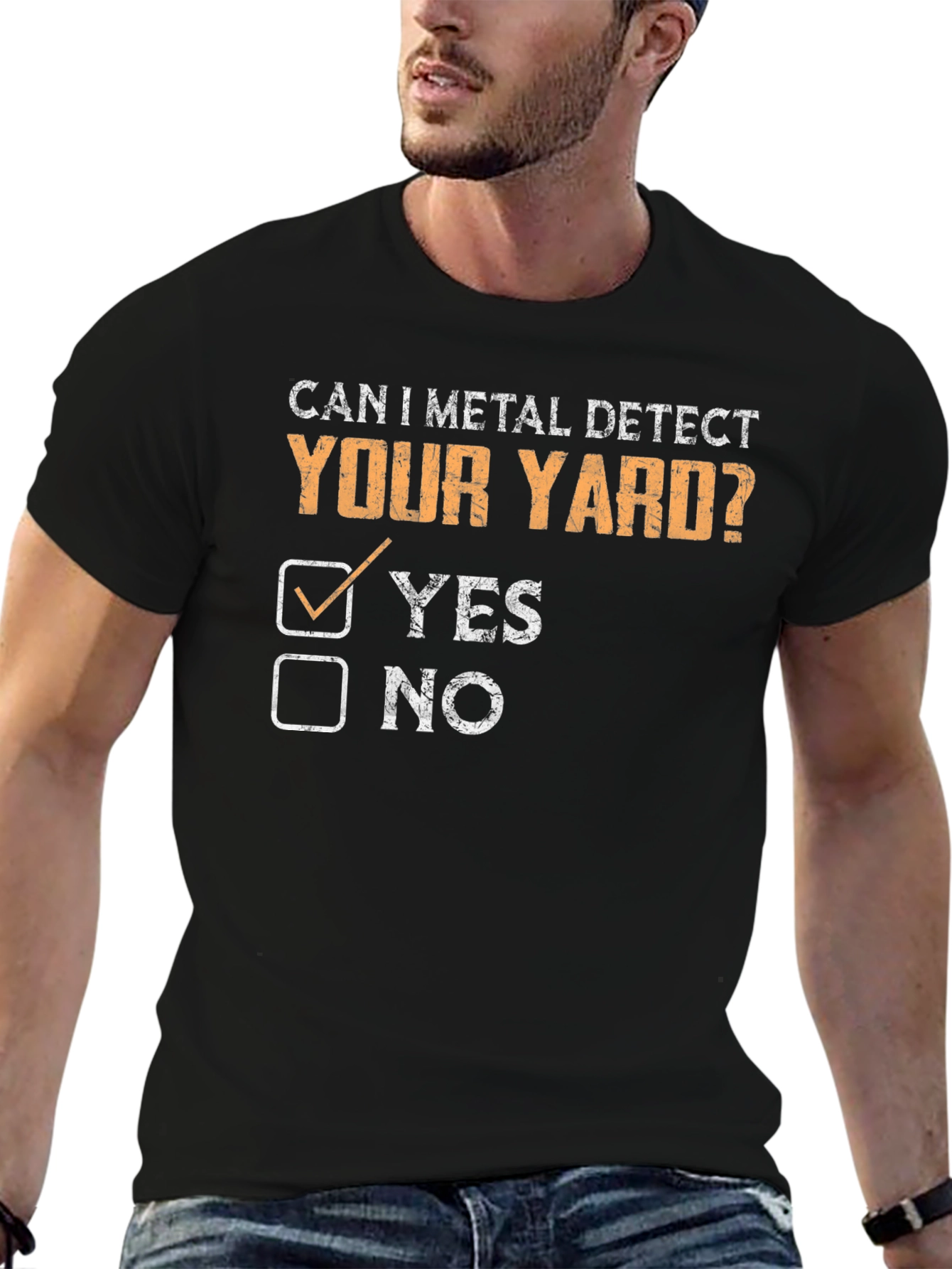 This classic black t-shirt features a humorous design perfect for metal detecting enthusiasts. The phrase "CAN I METAL DETECT YOUR YARD?" is printed in a distressed style, with "YOUR YARD?" highlighted in orange. Below, there's a checkbox graphic marked "YES" and an unmarked "NO" option, adding a playful touch. Made from comfortable-looking fabric, this tee is ideal for casual wear during metal detecting outings, club meetings, or just showing off your hobby. It's a great conversation starter and a fun gift for anyone passionate about treasure hunting!