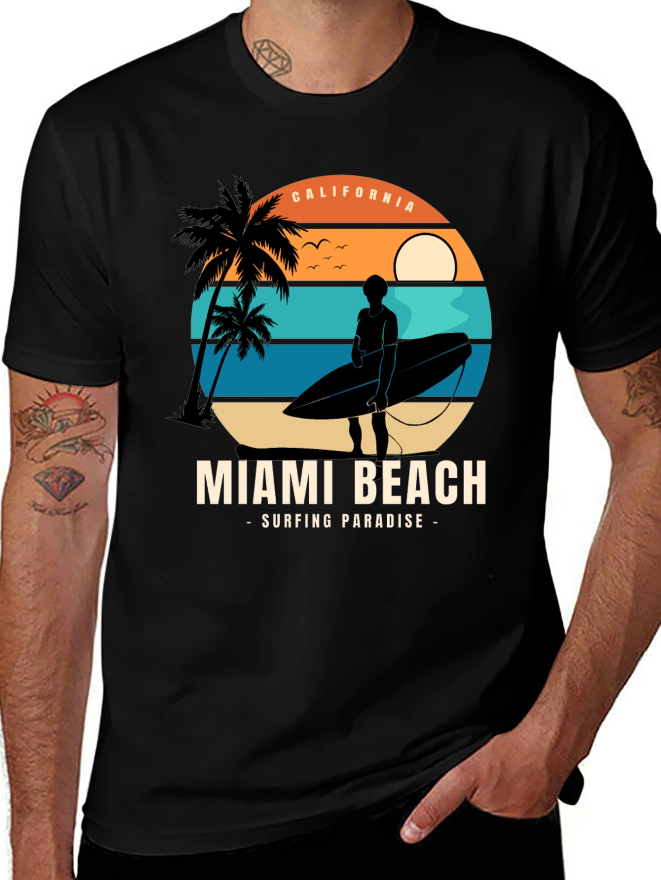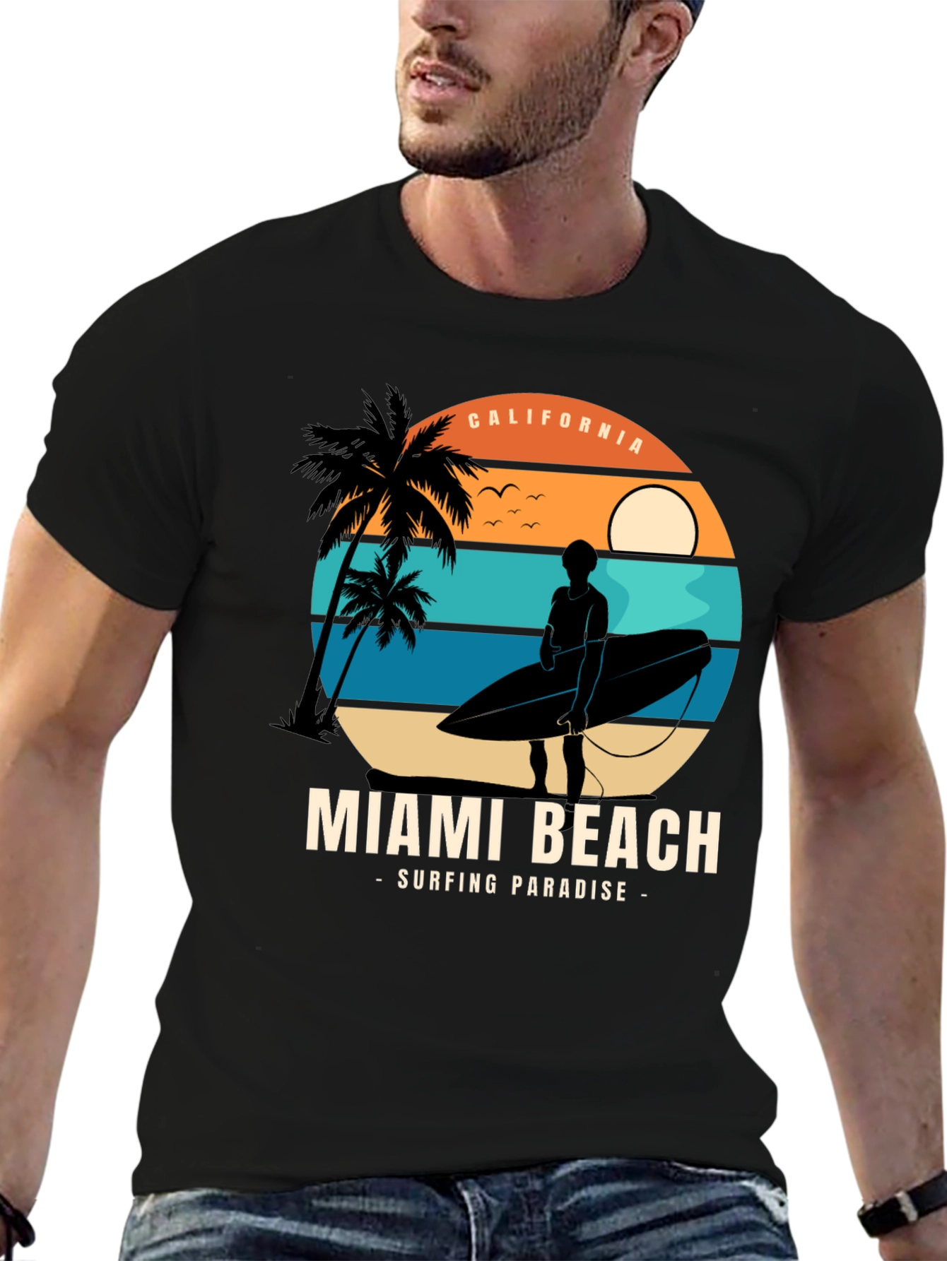 Embrace the beach vibes with this stylish graphic tee. Featuring a vintage-inspired sunset design with palm trees, a surfer silhouette, and 'Miami Beach - Surfing Paradise' text, this shirt is perfect for ocean lovers and casual wear. The classic black color complements the vibrant graphic, creating a standout piece. Made from comfortable, breathable fabric, it's ideal for everyday wear, beach outings, or a relaxed weekend look. Show off your love for the sun and surf with this unique tee.
