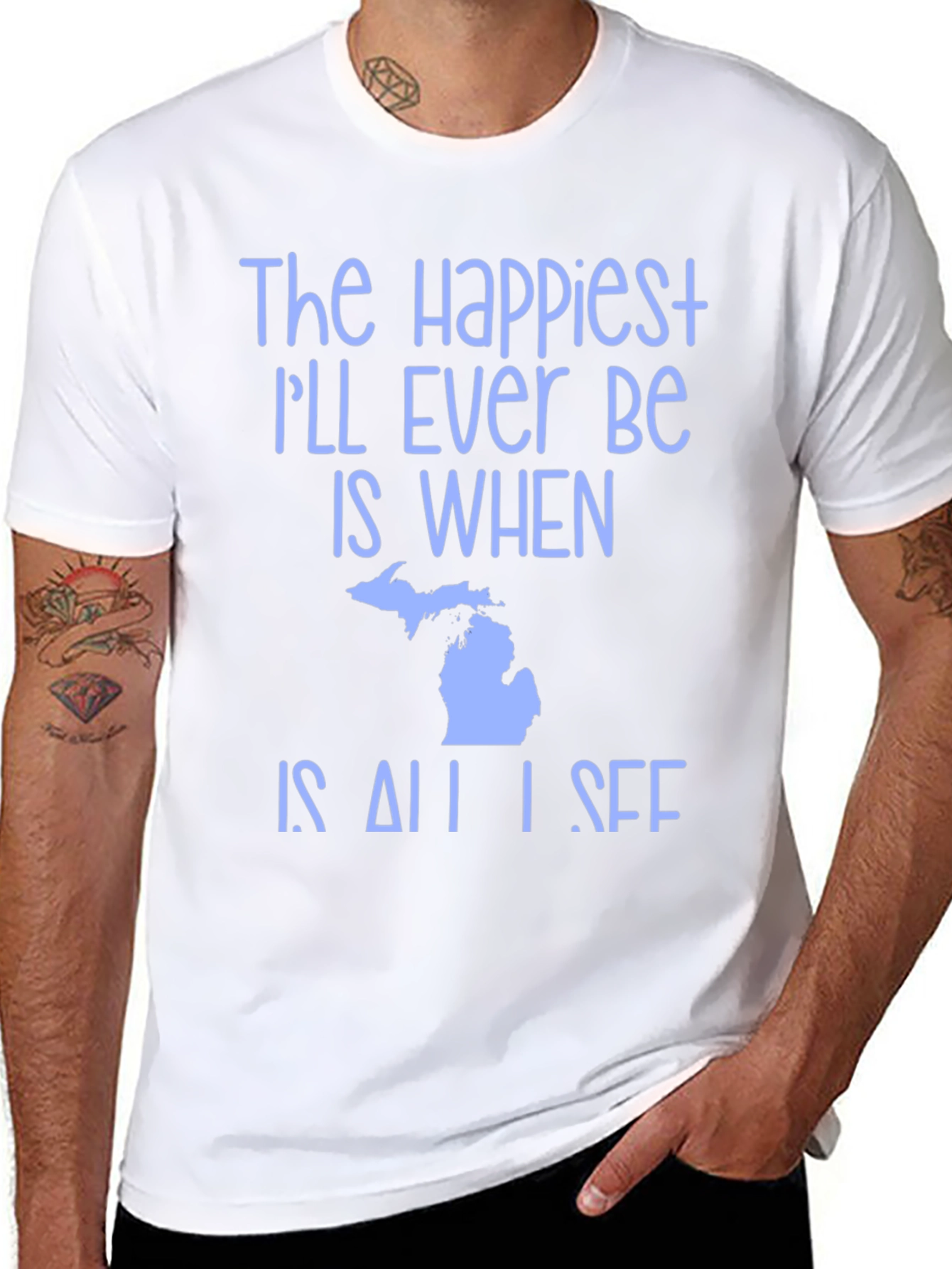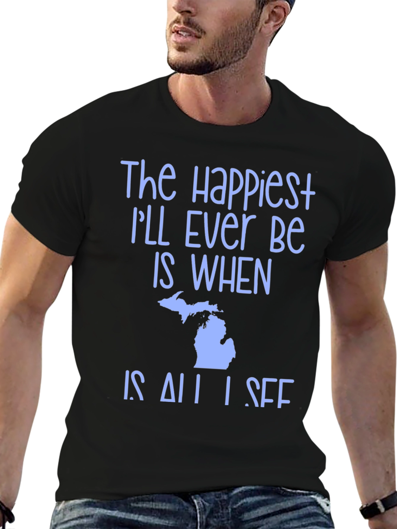Show your Michigan pride with this eye-catching black T-shirt! Featuring a playful yet heartfelt message, the phrase "The Happiest I'll Ever Be is When" is prominently displayed above a silhouette of the state of Michigan, followed by "Is All I See" underneath. The design is rendered in a light blue, creating a striking contrast against the dark backdrop. Made from comfortable, breathable fabric, this T-shirt is perfect for everyday wear, whether you're exploring the Great Lakes state or simply expressing your love for your home. A must-have for any Michigander!