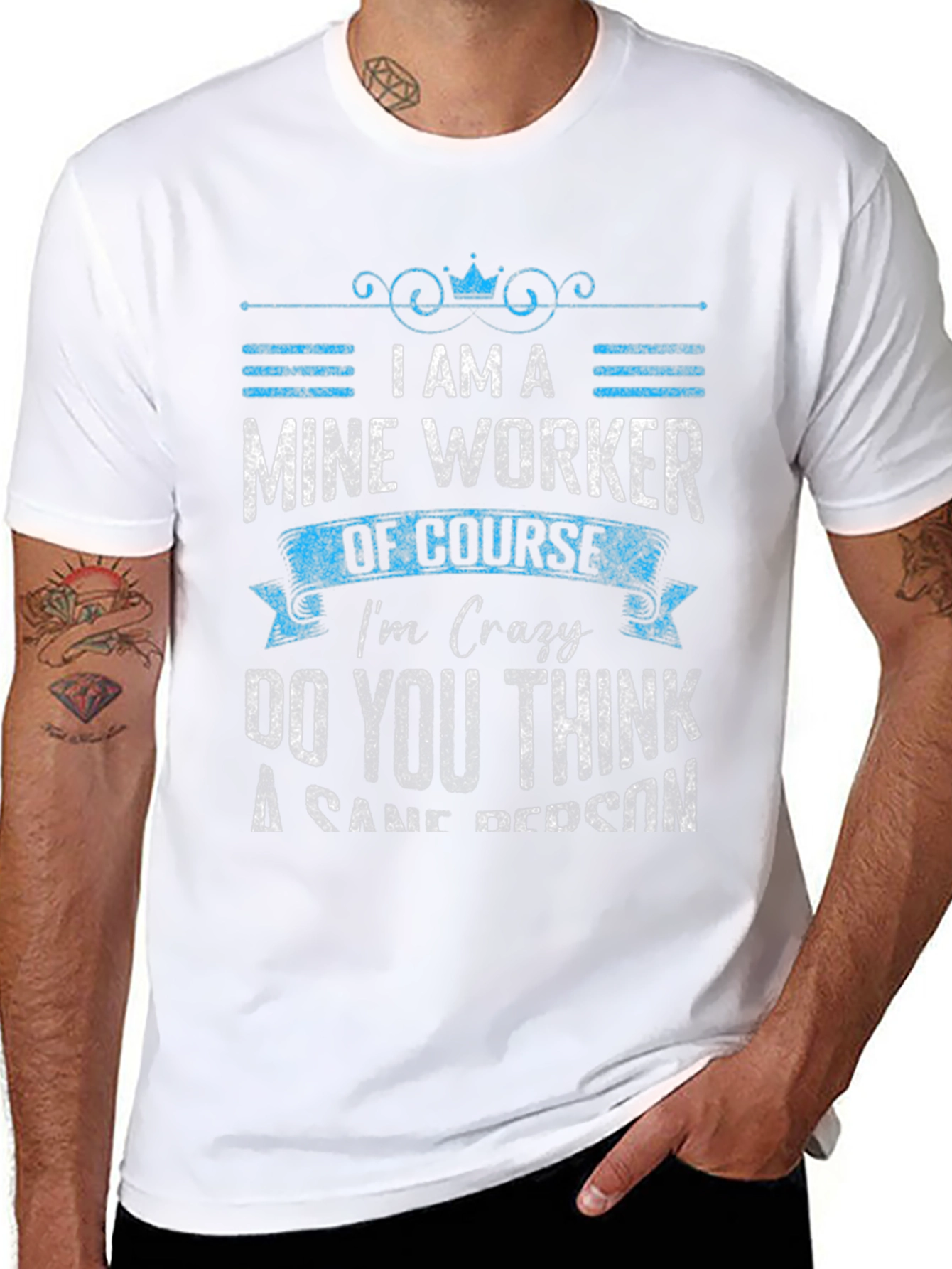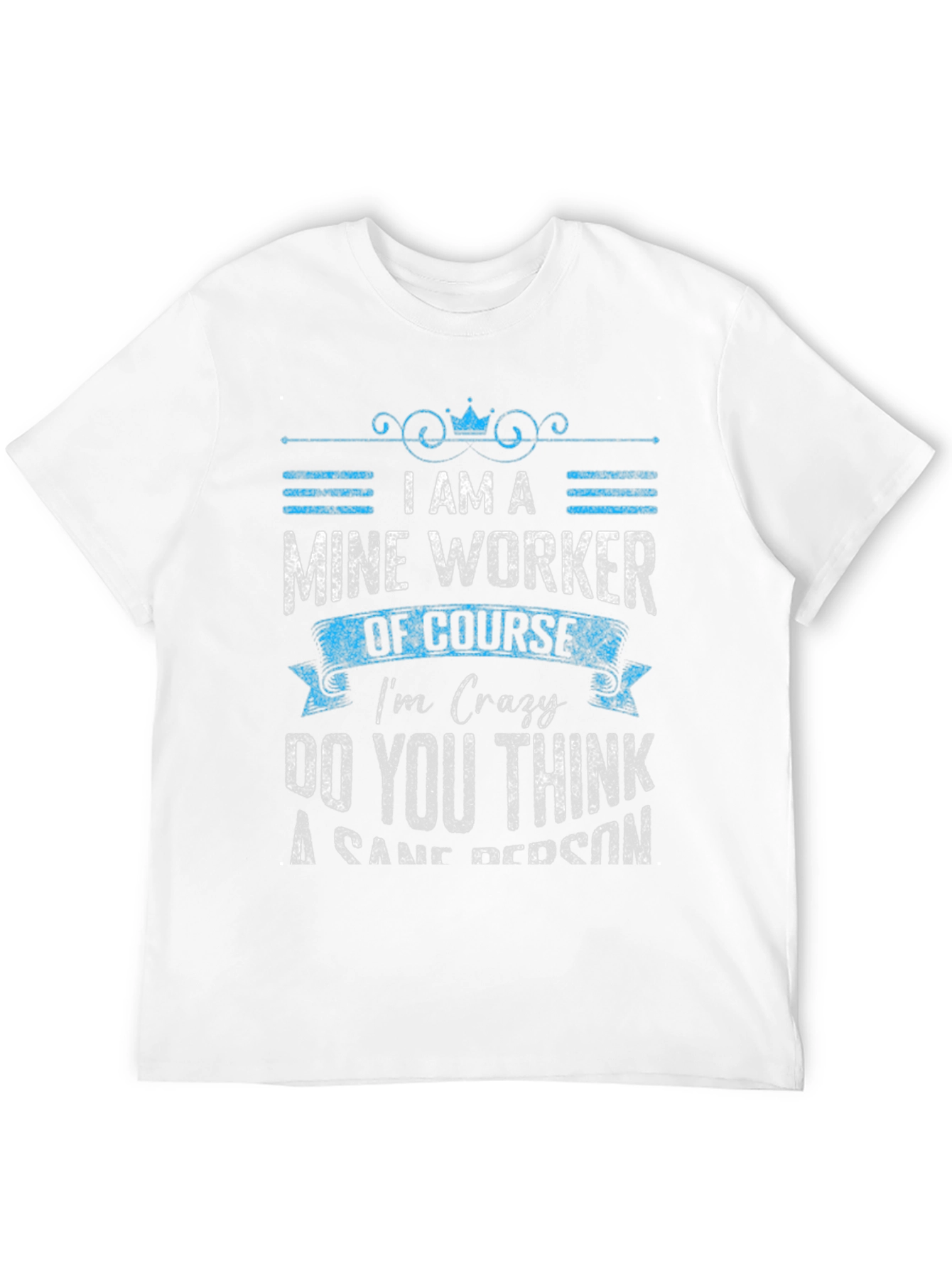 Show off your pride with this bold black t-shirt. The shirt features a humorous graphic in white and turquoise lettering, stating "I AM A MINE WORKER OF COURSE I'm Crazy DO YOU THINK A SAME DEOSAN". Perfect for miners with a sense of humor, this tee is a great conversation starter. Made from comfortable, breathable fabric, it's ideal for casual wear or work. A unique design sets it apart from other shirts, making it a standout piece in any wardrobe. Get yours today and let everyone know about your profession and personality!