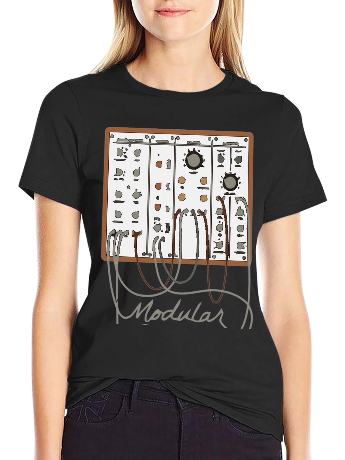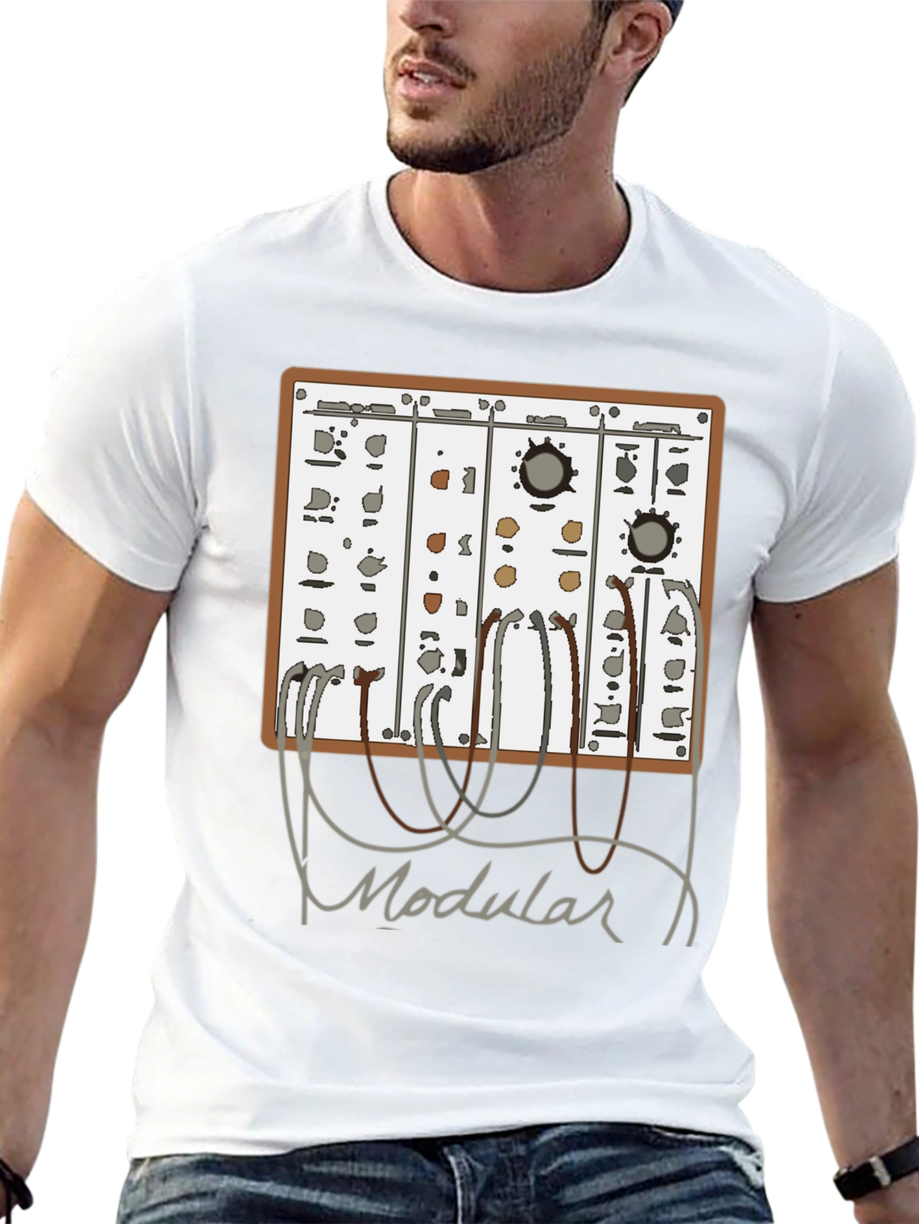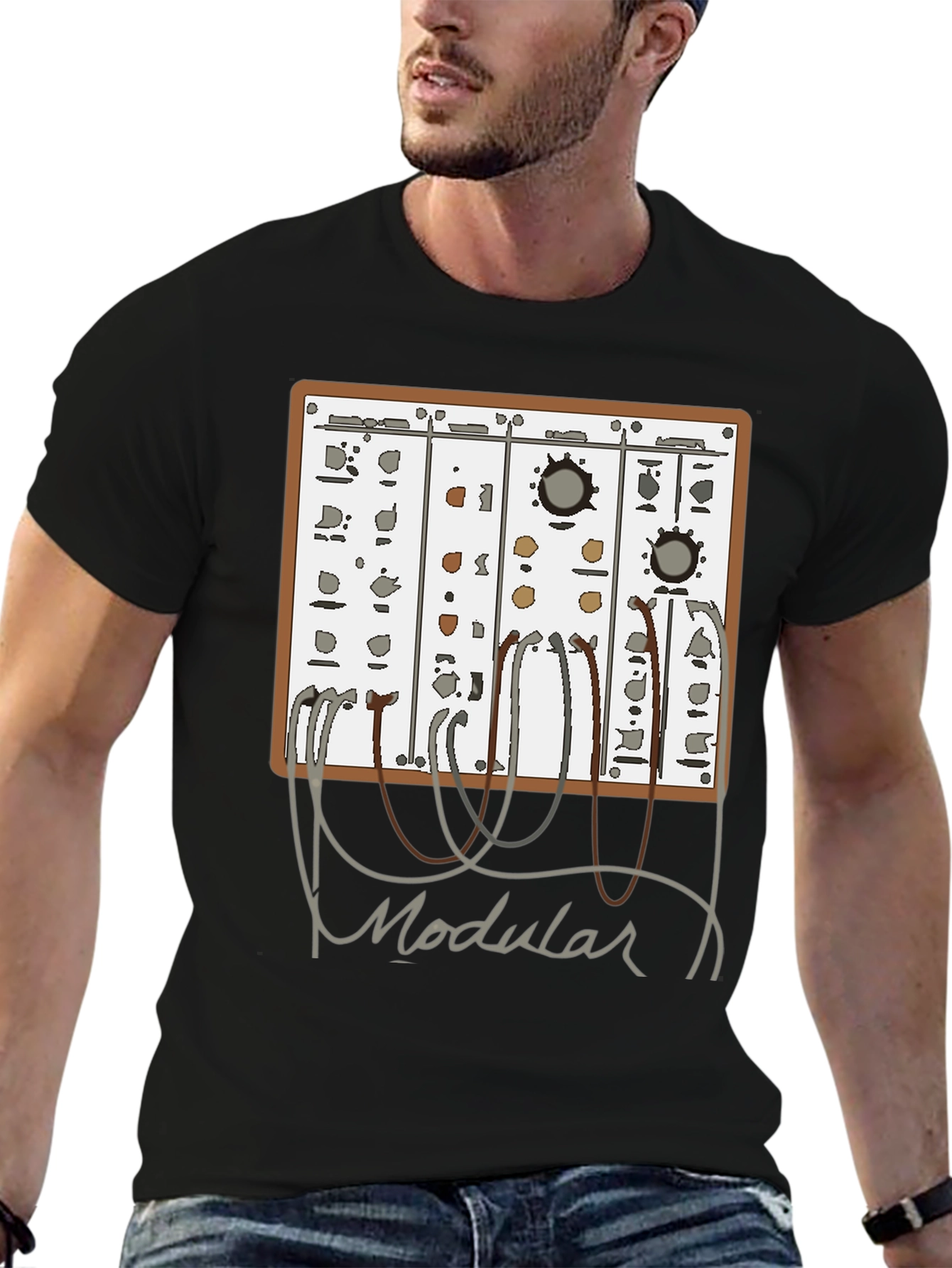 Rock this unique modular synthesizer t-shirt! Featuring a detailed graphic of a vintage-style synth with connecting patch cables, this tee is perfect for musicians, electronic music producers, and synth enthusiasts. The design is printed on a comfortable black tee. Show off your passion for sound design and analog gear with this awesome t-shirt. Great for casual wear, music events, or as a gift for the synth geek in your life. Get yours today and let the world know you love modular synthesis!