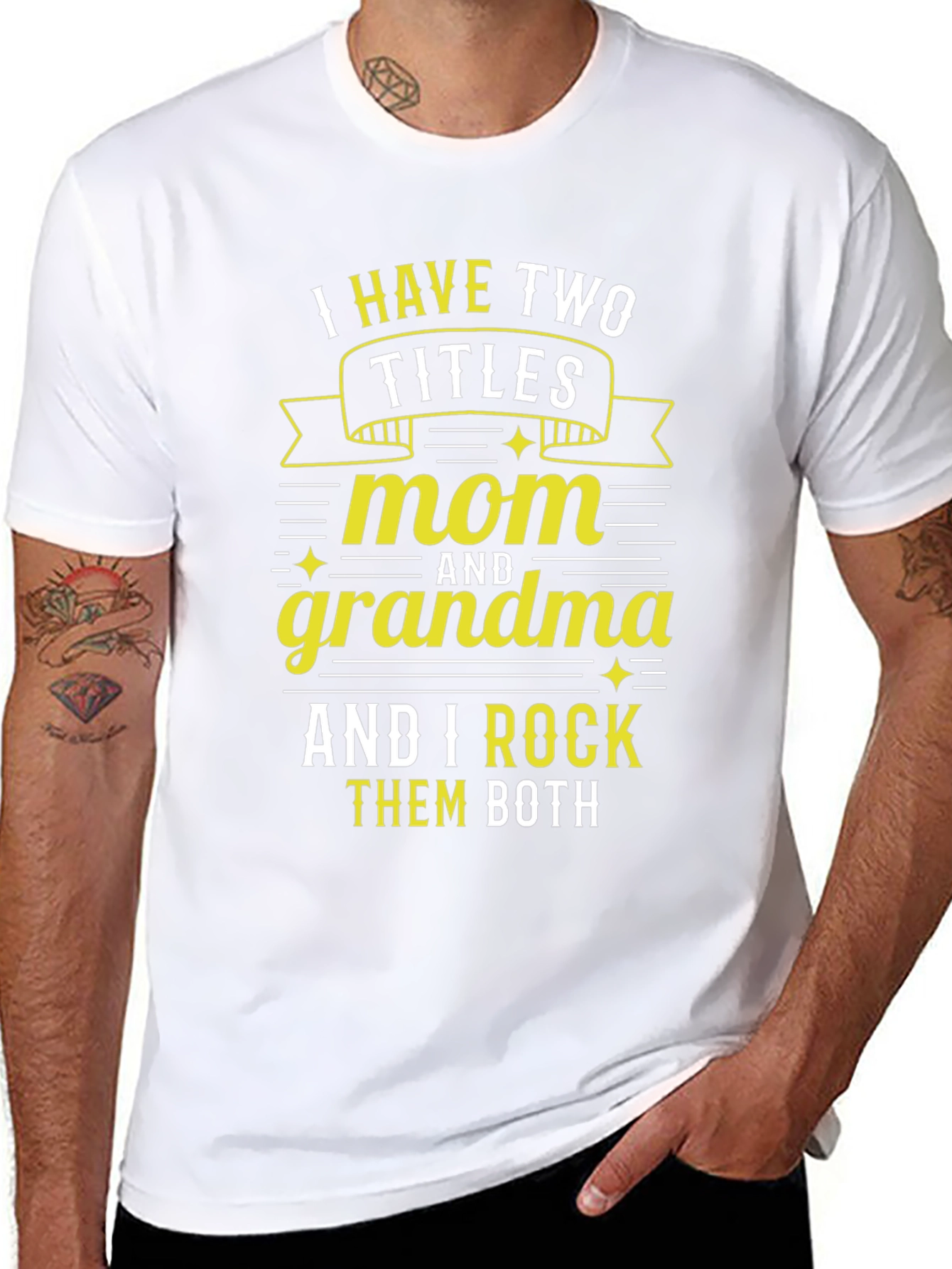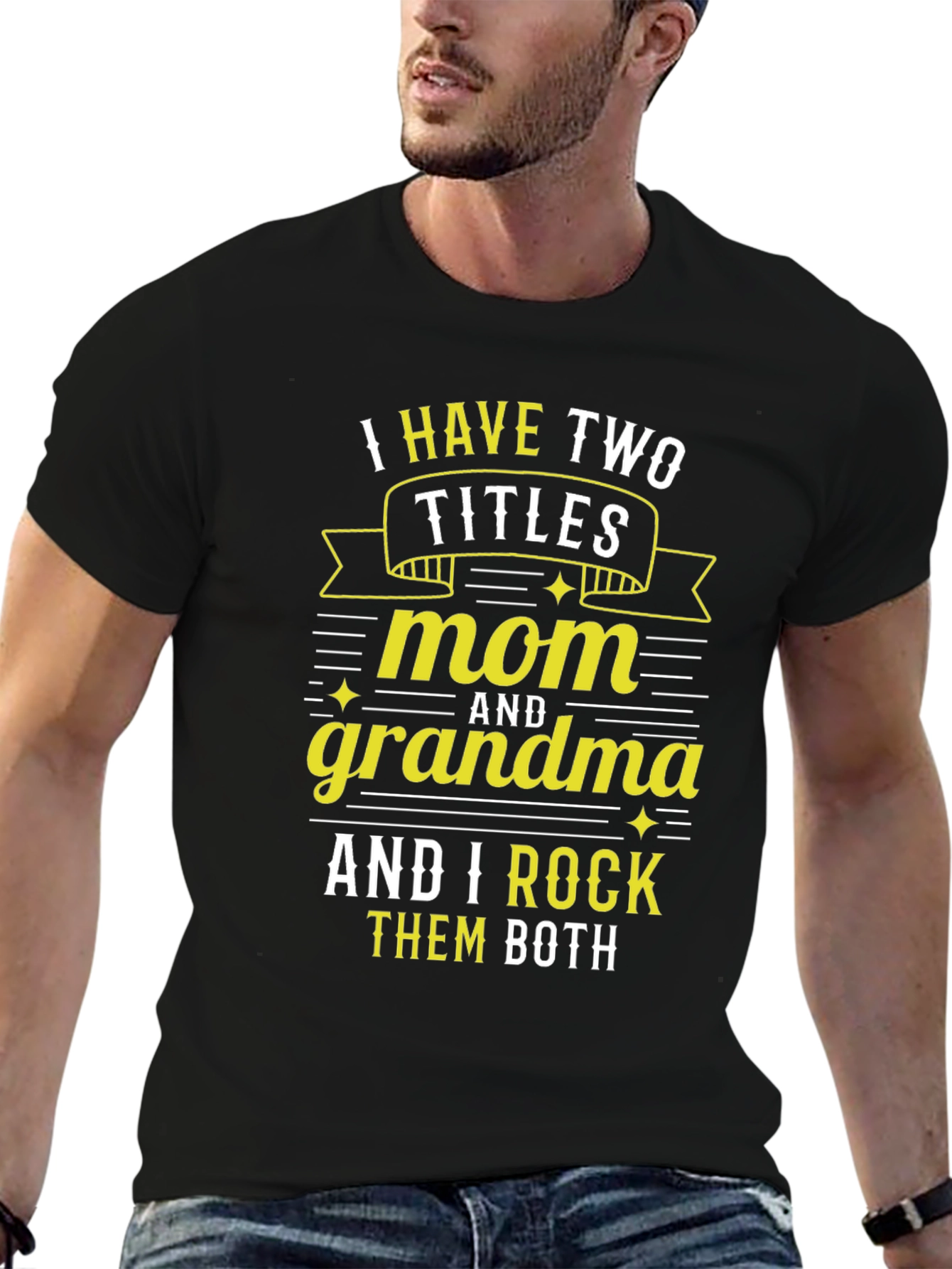 Show off your pride in being both a Mom and a Grandma with this fun t-shirt! The black tee features a vibrant yellow design with the phrase "I HAVE TWO TITLES mom AND grandma AND I ROCK THEM BOTH." Made from a soft-looking fabric, this classic crewneck tee is comfortable for everyday wear. Perfect for casual outings, family gatherings, or as a thoughtful gift for the amazing women in your life. Let the world know how much you love your roles with this unique shirt!
