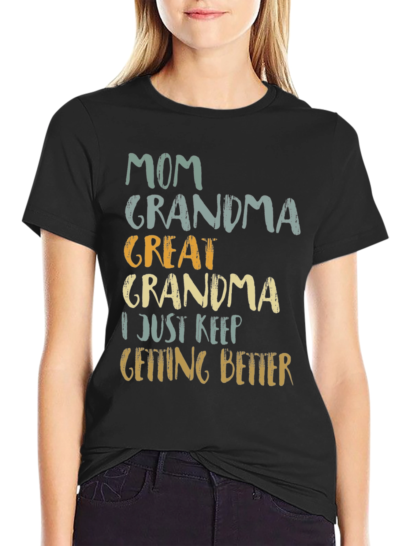 This black t-shirt proudly proclaims 'Mom Grandma Great Grandma I Just Keep Getting Better' in a stylish, multi-colored font. The text is a combination of teal, gold, and sandy brown. Made from what appears to be a soft and comfortable cotton blend, this tee is perfect for showing off your family pride and sense of humor. The classic fit makes it a versatile piece for casual outings, family gatherings, or simply relaxing at home. A great gift idea for the matriarch of the family who embraces every stage of life with grace and a smile!