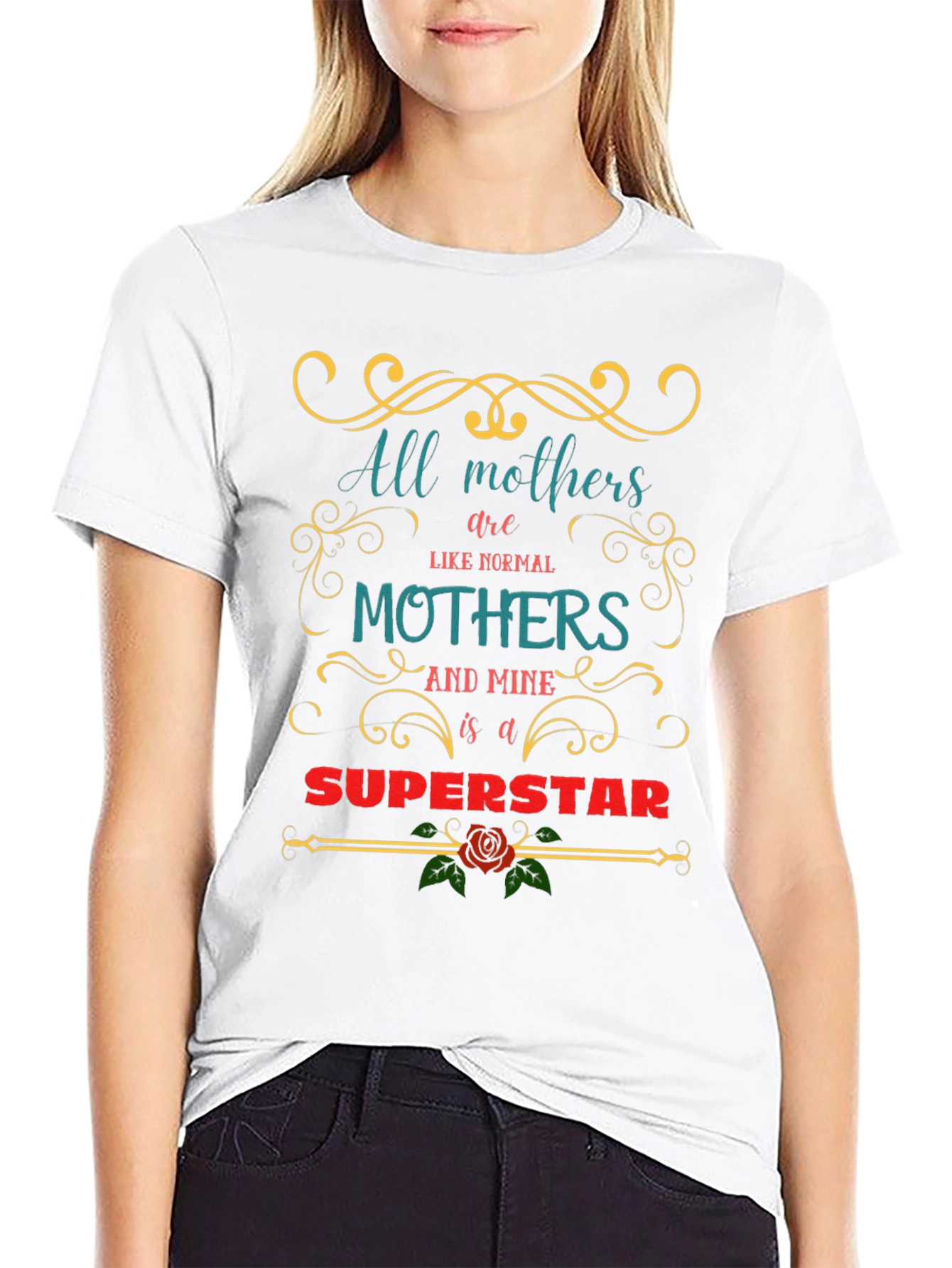 Celebrate Mom with this stylish black t-shirt! Featuring the heartwarming message "All mothers are like normal MOTHERS and mine is a SUPERSTAR" in elegant script, this shirt is perfect for showing your appreciation. The design includes decorative flourishes in gold and teal and a small red rose. Made from comfortable, breathable material, this t-shirt is ideal for everyday wear. A great gift for Mother's Day, birthdays, or any occasion to honor that special woman in your life!