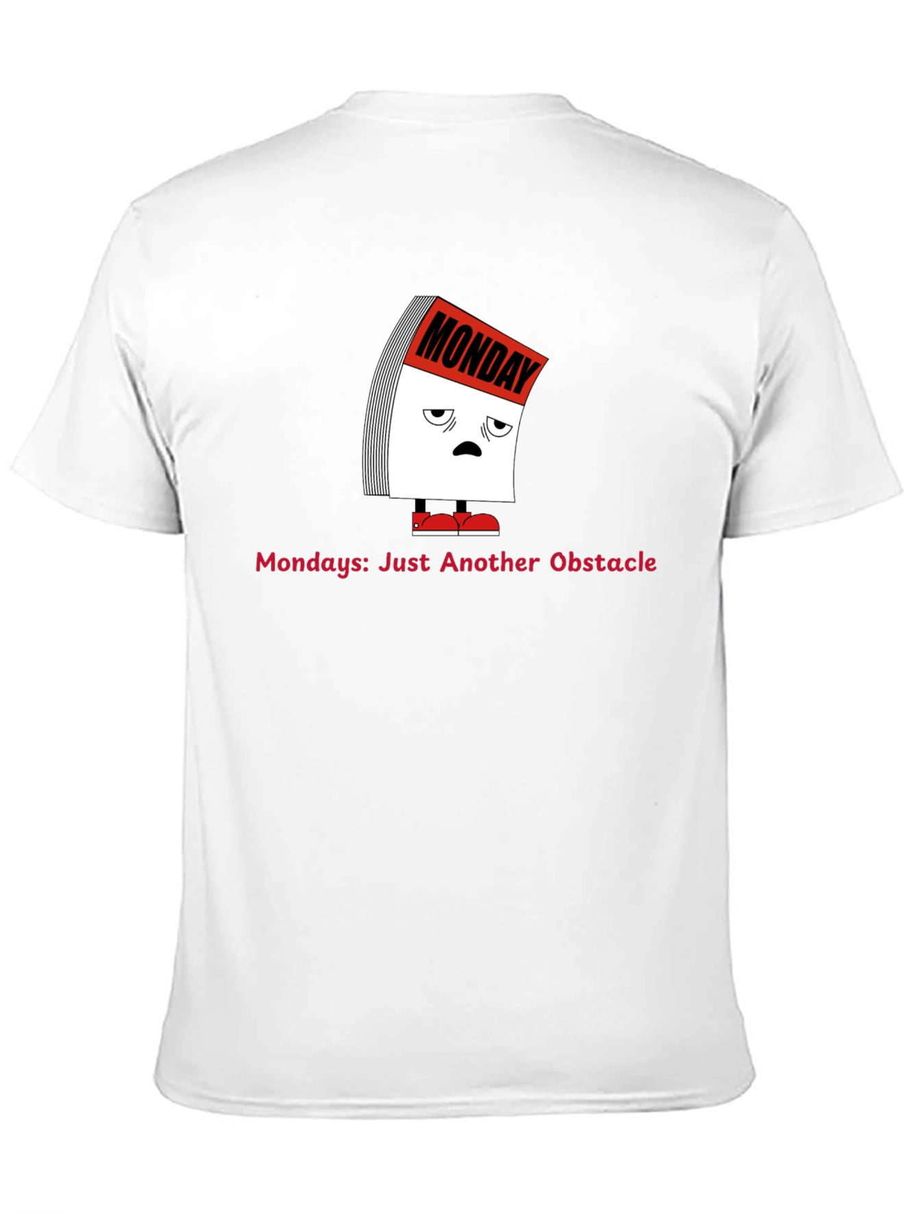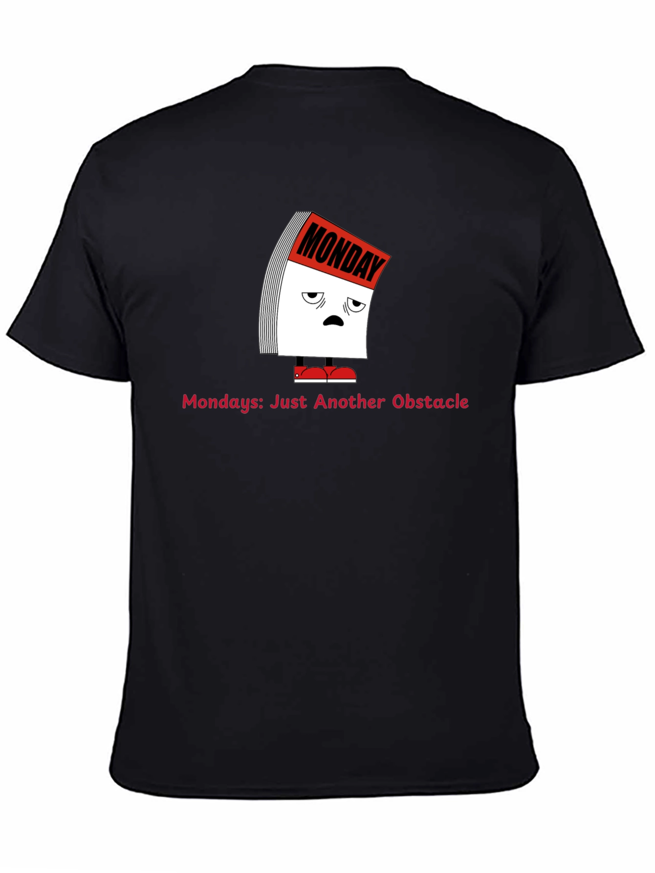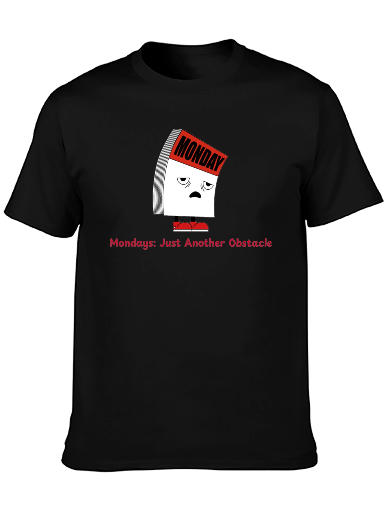 Embrace the start of the week with a touch of humor in this eye-catching black graphic tee! Featuring a distressed calendar character with a Monday label and a gloomy expression, this shirt playfully acknowledges the universal feeling about Mondays. The design includes the phrase "Mondays: Just Another Obstacle" in a complementary font, adding to its quirky appeal. Made from a soft, comfortable fabric, this tee is perfect for casual wear, office settings, or weekend lounging. Showcase your witty side and tackle Mondays head-on with this conversation-starting t-shirt. It also makes a great gift for friends, family, or coworkers who share your Monday sentiments.