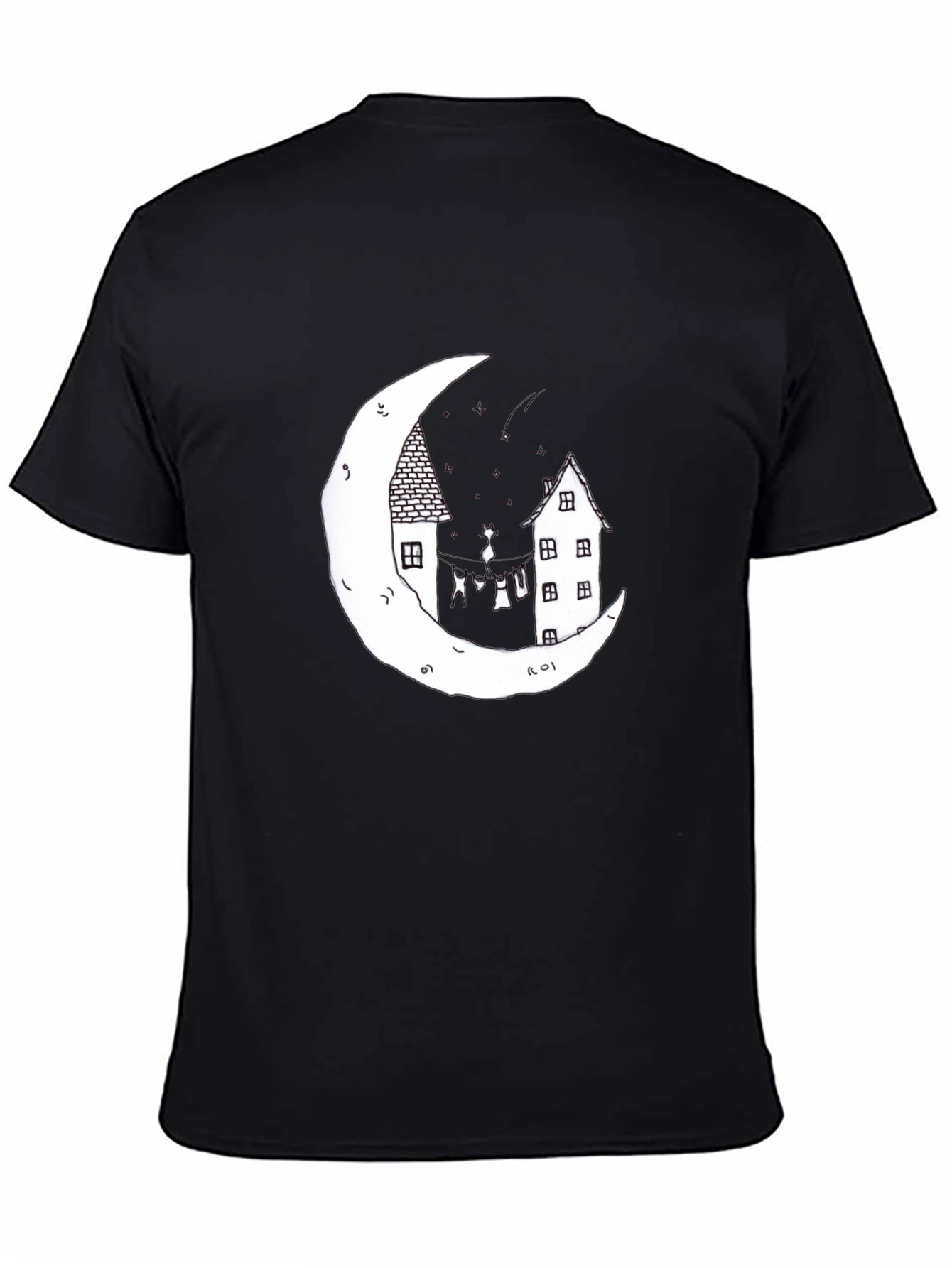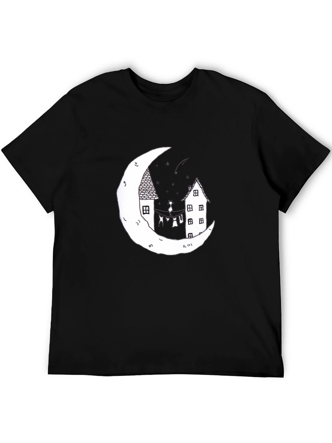 Embrace whimsical style with this eye-catching black T-shirt. Featuring a unique graphic of a crescent moon cradling two houses with cats on a clothesline, this tee is perfect for cat lovers and dreamers alike. The design is printed in crisp white, offering a striking contrast against the black fabric. Crafted from a soft, comfortable material, this T-shirt is ideal for everyday wear. Whether you're lounging at home, running errands, or meeting friends, this shirt will add a touch of charm to your outfit. Express your individuality and showcase your love for cats with this must-have graphic tee.