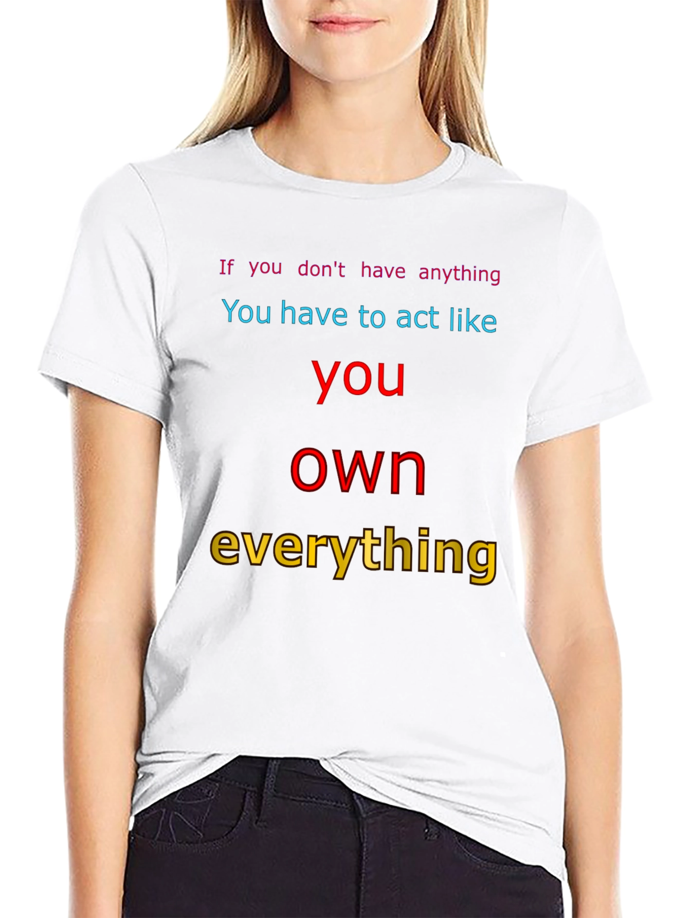This bold black t-shirt makes a statement. Featuring a motivational quote in vibrant colors, it reads: "If you don't have anything, You have to act like you own everything." The contrasting colors—magenta, cyan, red, and yellow—ensure the message pops. Made from a soft, breathable fabric, this tee is perfect for casual wear or making an impact. It's more than just apparel; it's a confidence booster, ideal for anyone striving to achieve their goals. Wear it as a daily reminder to project strength and self-belief. Step out with style and inspire those around you with this unique and empowering t-shirt.