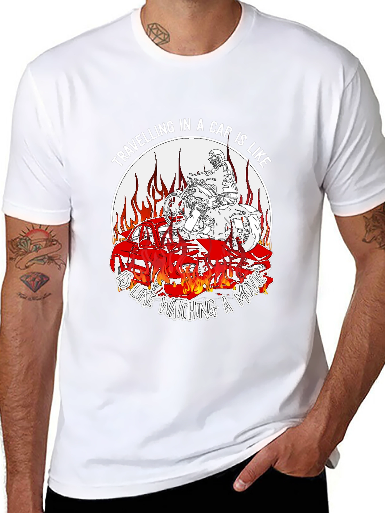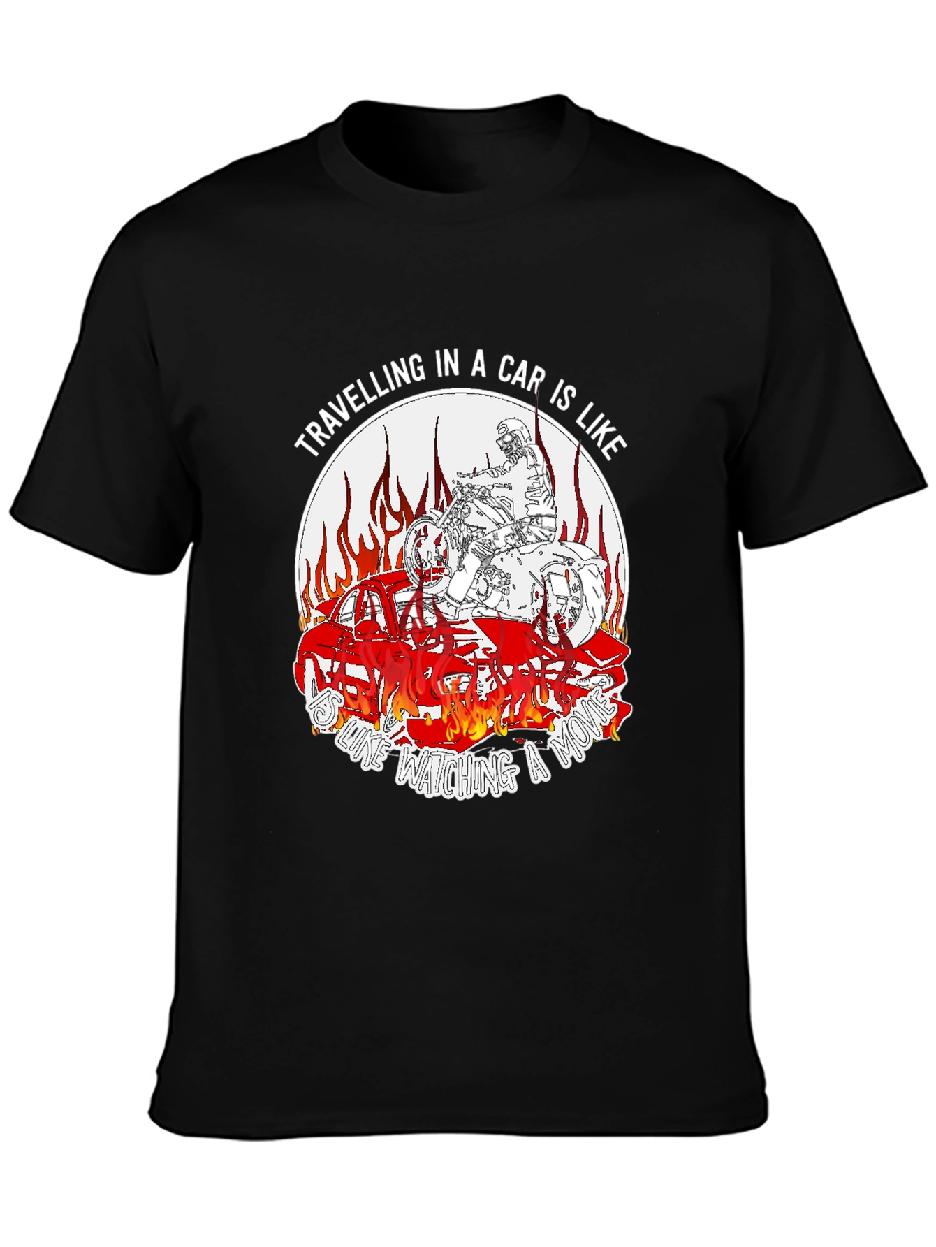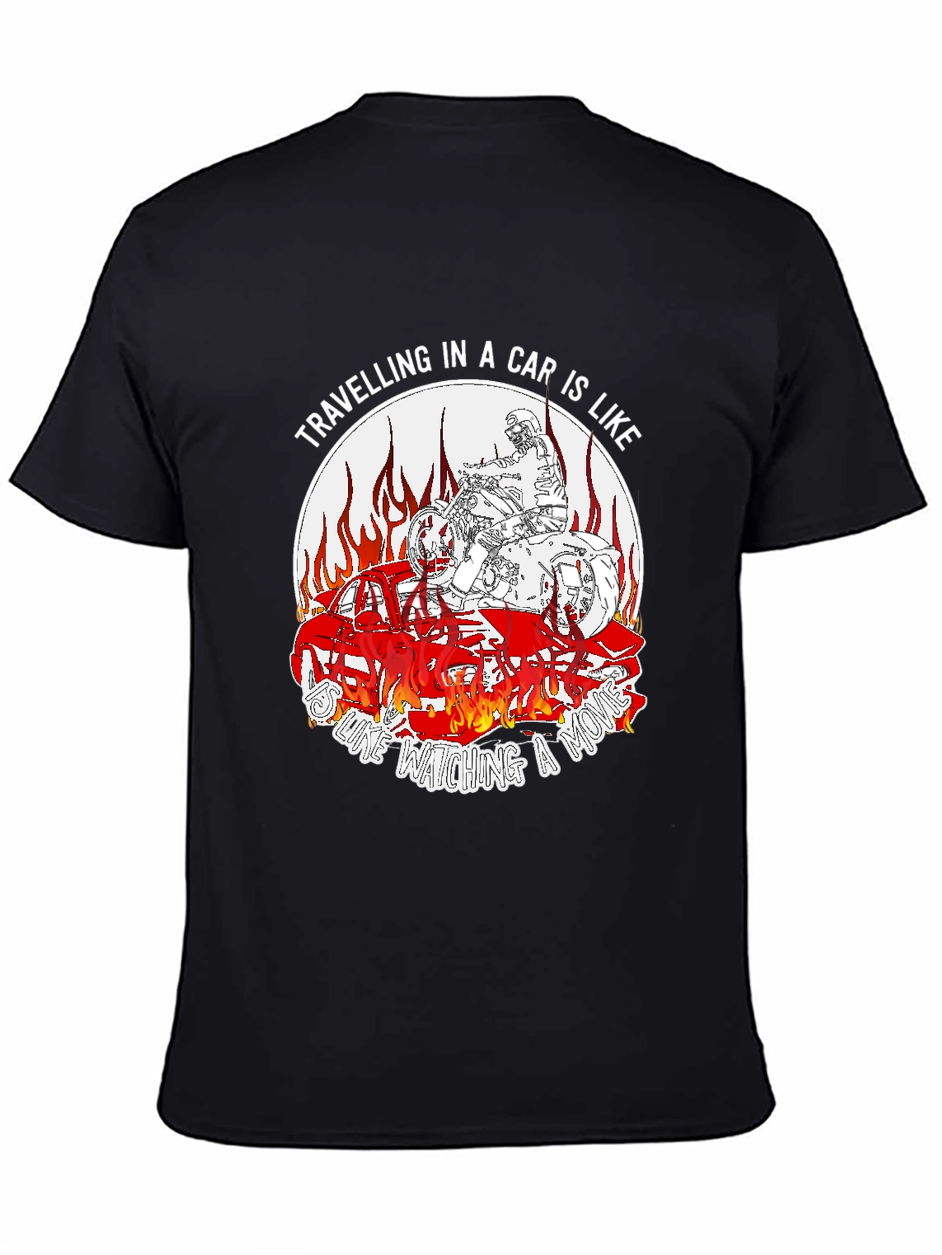 This black t-shirt features a bold graphic print, perfect for motorcycle enthusiasts. The design includes a car and rider, surrounded by flames, with the text "TRAVELLING IN A CAR IS LIKE IS LIKE WATCHING A MOVIE". It's a stylish statement piece. Made from comfortable cotton fabric, this tee offers a relaxed fit suitable for everyday wear. Showcase your love for motorcycling. Great for casual outings, bike meetups, or as a gift for the rider in your life.