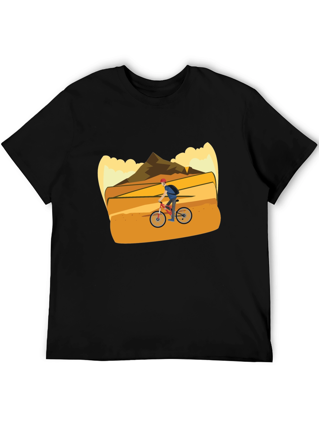 Show off your adventurous side with this stylish black graphic tee. Featuring a unique design of a cyclist riding through a mountainous landscape, this shirt is perfect for outdoor enthusiasts and anyone who loves a touch of wanderlust in their wardrobe. The design showcases warm, earthy tones that beautifully contrast with the shirt's sleek black backdrop. Made from comfortable materials, this tee is perfect for everyday wear, whether you're hitting the trails or simply hanging out with friends. Pair it with your favorite jeans or shorts for a casual yet eye-catching look. Get ready to inspire your style with this adventure tee!