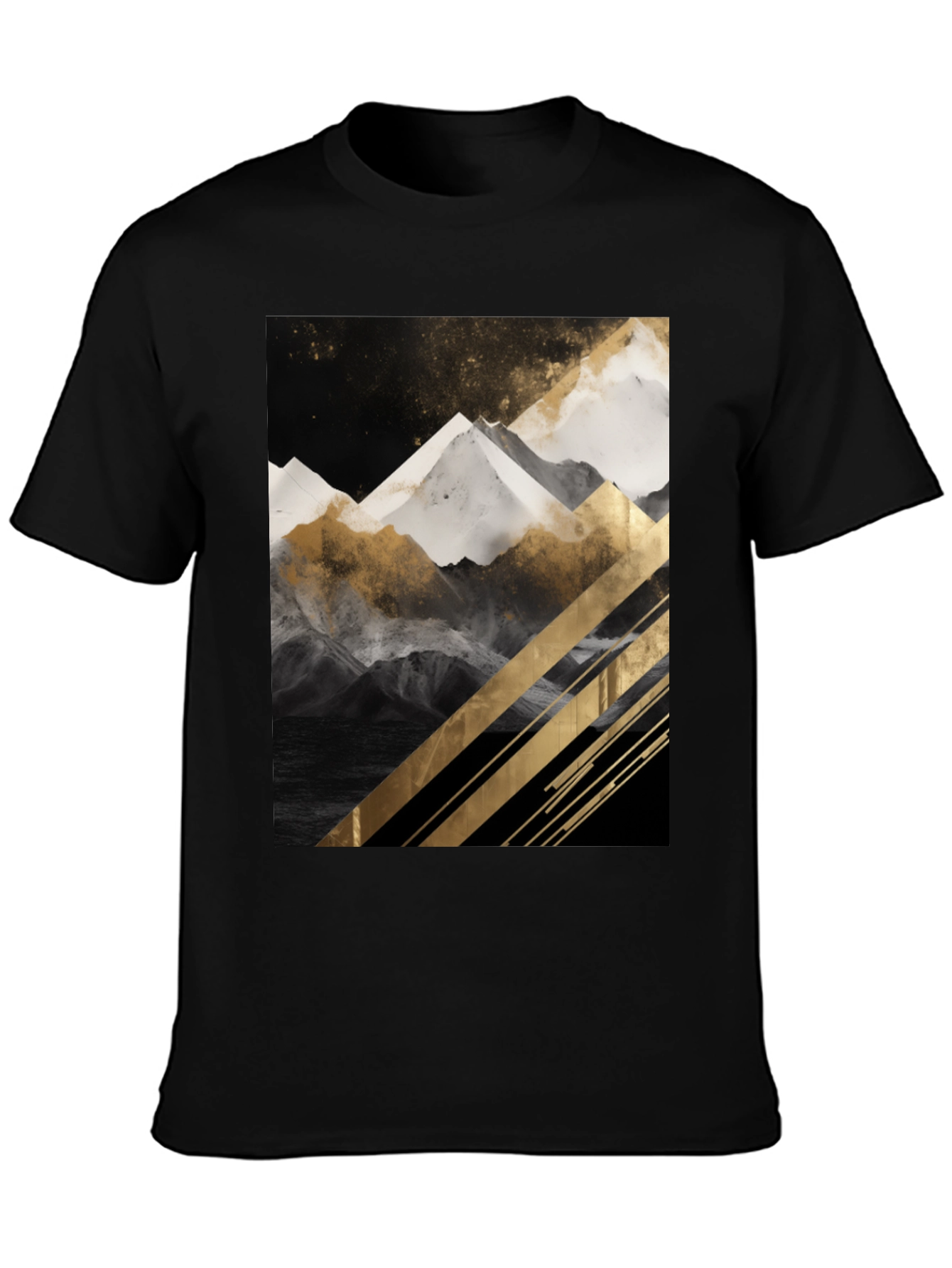 Elevate your casual style with this striking graphic tee. Featuring a modern mountain design with bold gold and black accents, this shirt is a wearable work of art. The abstract landscape adds a touch of sophistication to any outfit. Made from comfortable, breathable fabric, this tee is perfect for everyday wear. Pair it with jeans for a relaxed look, or dress it up with a blazer for a night out. Make a statement with this uniquely designed t-shirt.