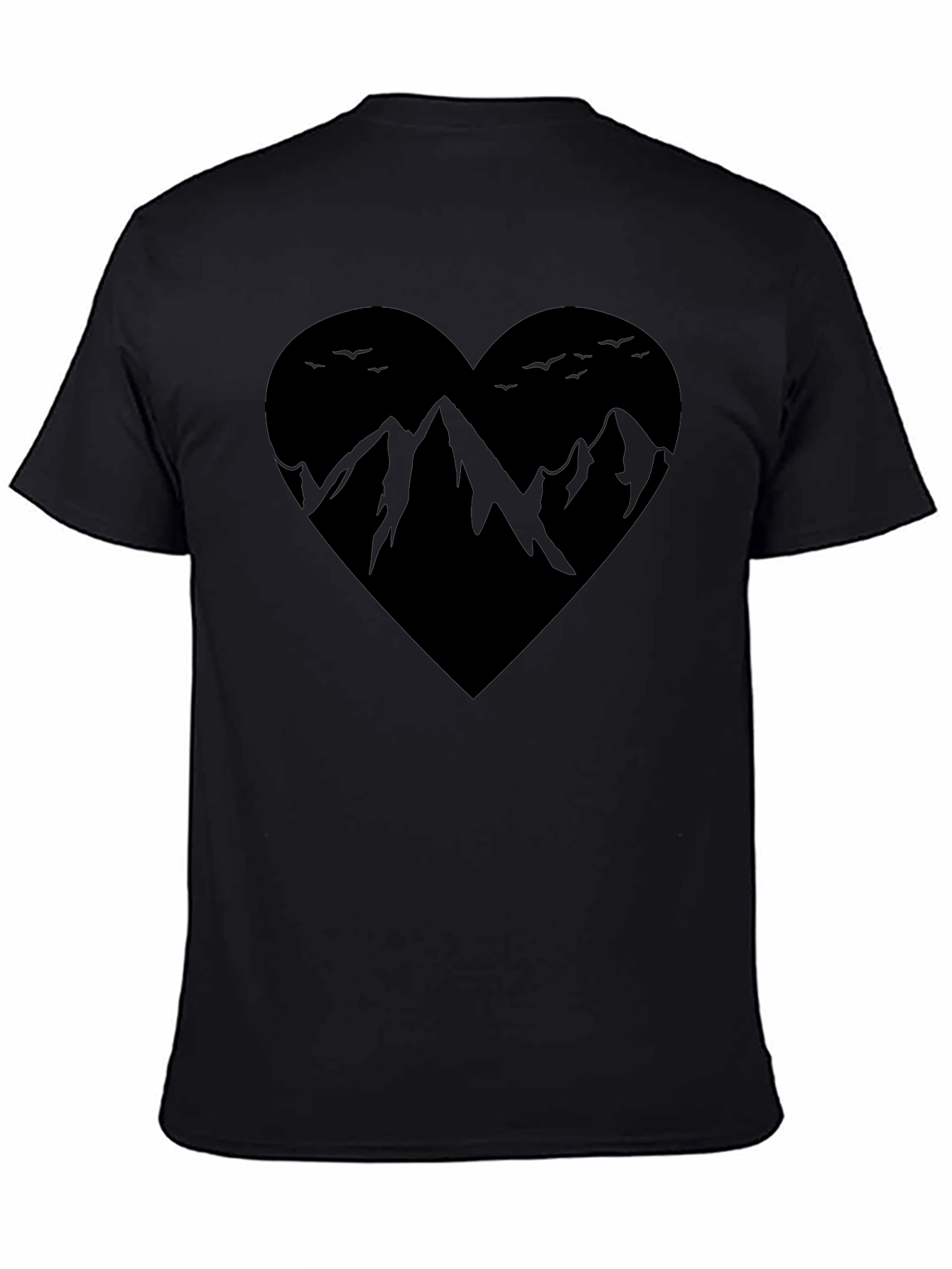 Embrace your love for the outdoors with this stylish black graphic tee. Featuring a unique heart-shaped design filled with a mountain range silhouette and flying birds, this shirt is perfect for nature enthusiasts. Made from a comfortable, soft fabric, it's ideal for casual wear or outdoor adventures. Show off your passion for exploration and style with this eye-catching tee. Great for everyday wear, hiking, or camping trips. A must-have addition to any wardrobe!