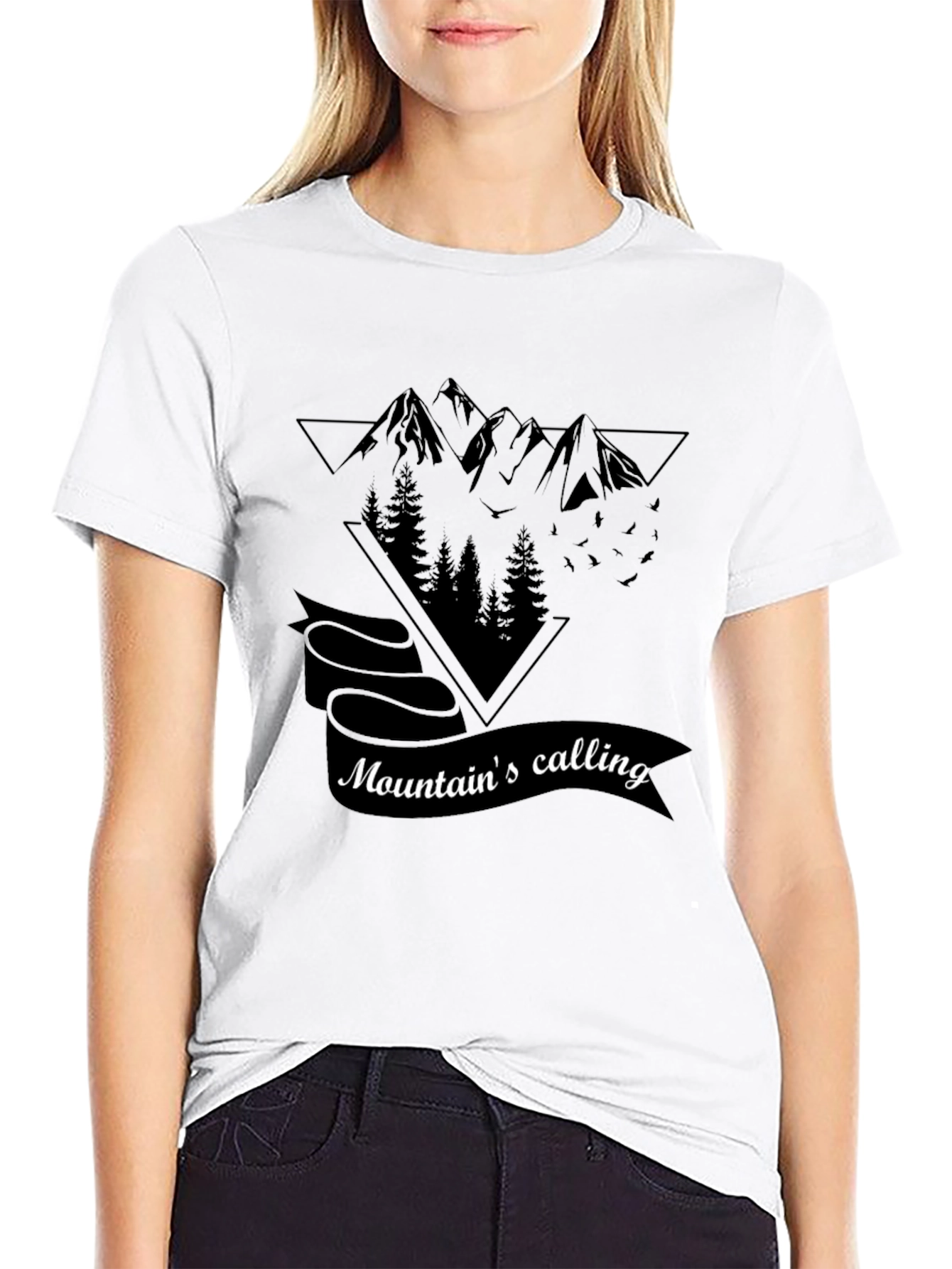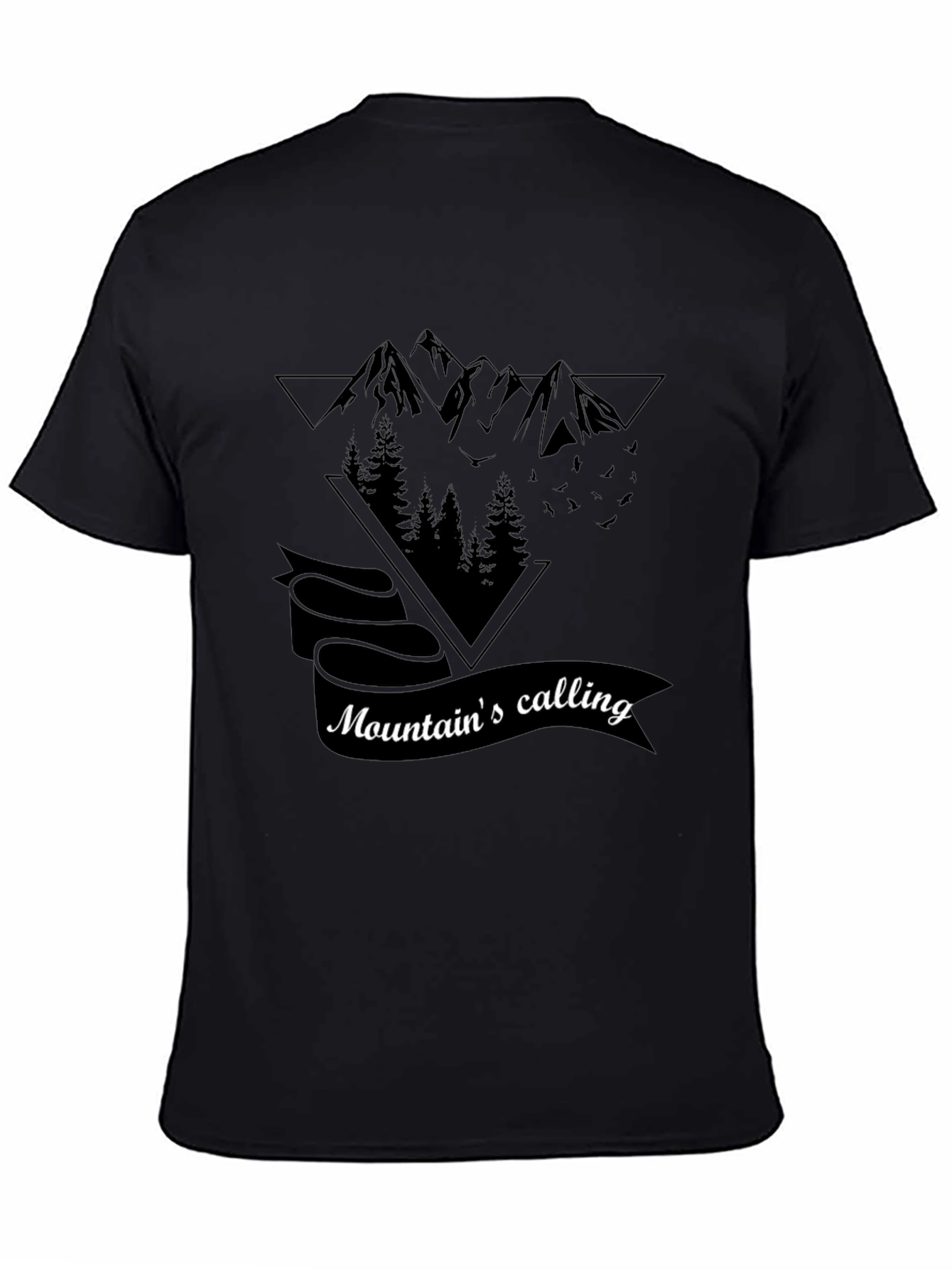 Embrace your adventurous spirit with this stylish black graphic t-shirt. The design features a striking mountainscape graphic, complete with towering peaks, evergreen trees, and birds in flight, all framed within a bold triangle. A flowing banner proudly declares "Mountain's calling," inviting you to explore the great outdoors. Crafted from a comfortable, breathable fabric, this tee is perfect for everyday wear, hiking trips, or casual outings. Let the world know where your heart belongs – in the mountains!