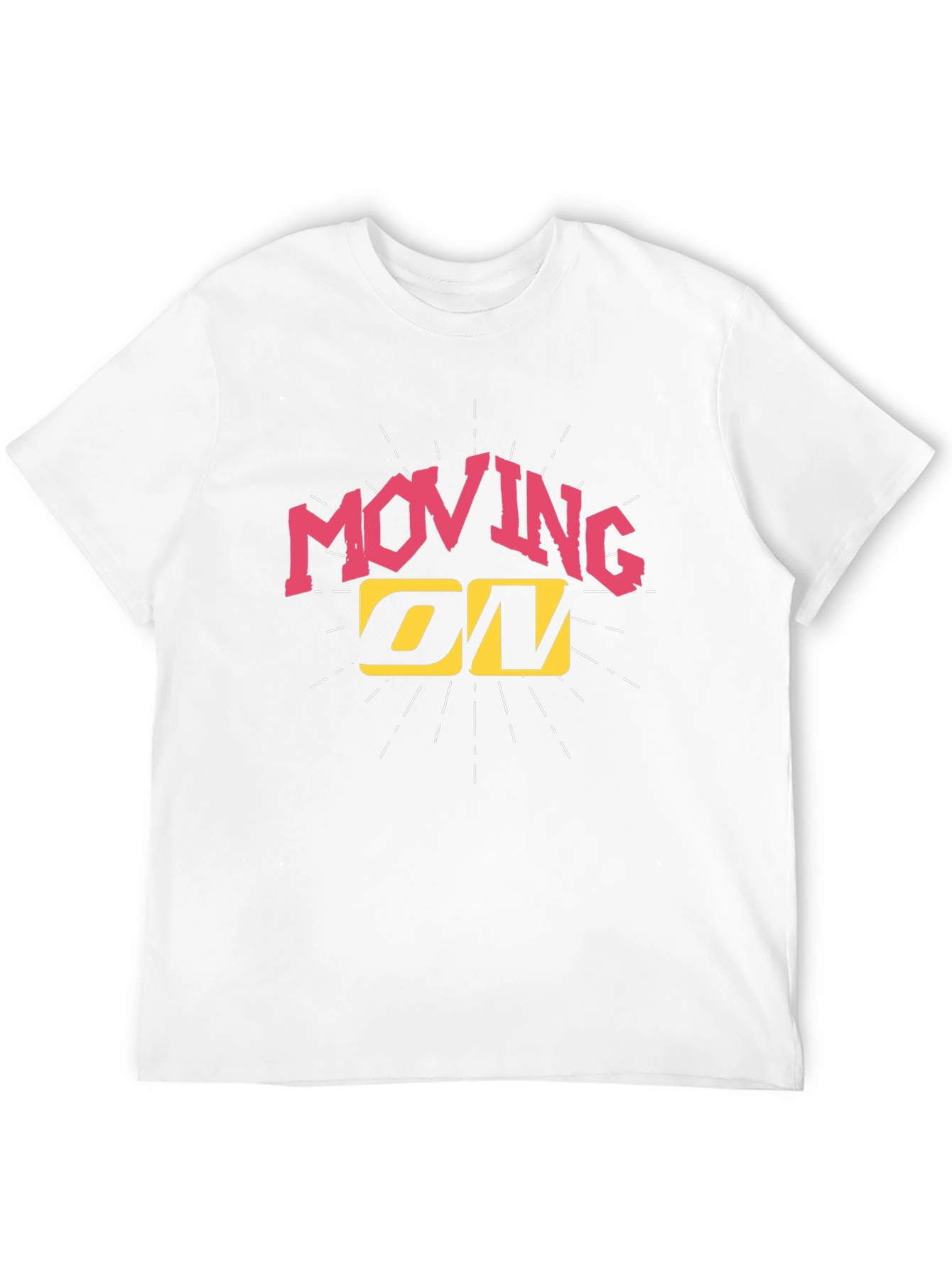 Rock this bold, black t-shirt featuring a striking graphic design that says "Moving On." The design incorporates a pink, stylized font above a vibrant yellow, rectangular box. The letters "ON" are set inside. Faint white lines radiate outward from the design adding a touch of energy. Made from comfortable, breathable fabric, this short-sleeved tee is perfect for casual wear. Show off your upbeat attitude and move forward in style! Ideal for everyday wear, concerts, or expressing your positive vibes.