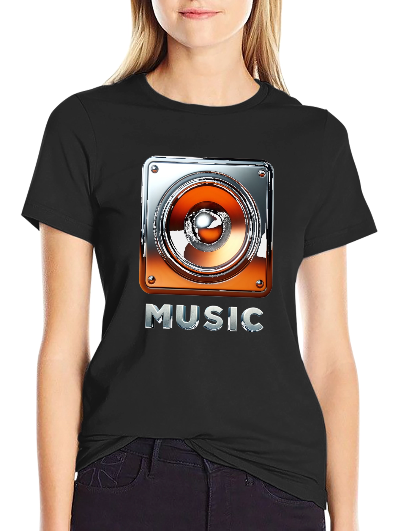 Showcase your love for music with this stylish black graphic tee. The shirt features a bold, eye-catching design of a speaker with the word "MUSIC" displayed beneath. The speaker graphic has a metallic and orange finish, providing a unique and modern look. Made from comfortable and durable material, this t-shirt is perfect for everyday wear, concerts, music festivals, or casual hangouts. Its unique graphic design makes it a standout piece that will surely spark conversations. A great gift for music enthusiasts!