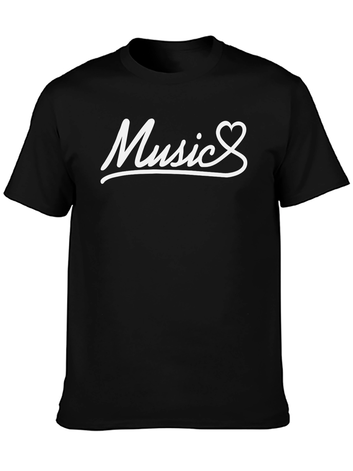 Showcase your love for music with this stylish black t-shirt. Featuring a clean, white "Music" design incorporating a heart symbol, this tee is perfect for casual wear or music events. Made from comfortable cotton, it offers a relaxed fit and is ideal for everyday use. The bold print ensures you'll stand out while expressing your passion. Whether you're a musician or a music enthusiast, this t-shirt is a great addition to your wardrobe. Get yours today and let the world know where your heart lies!