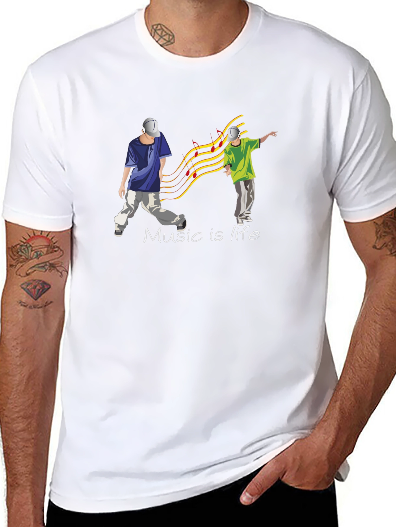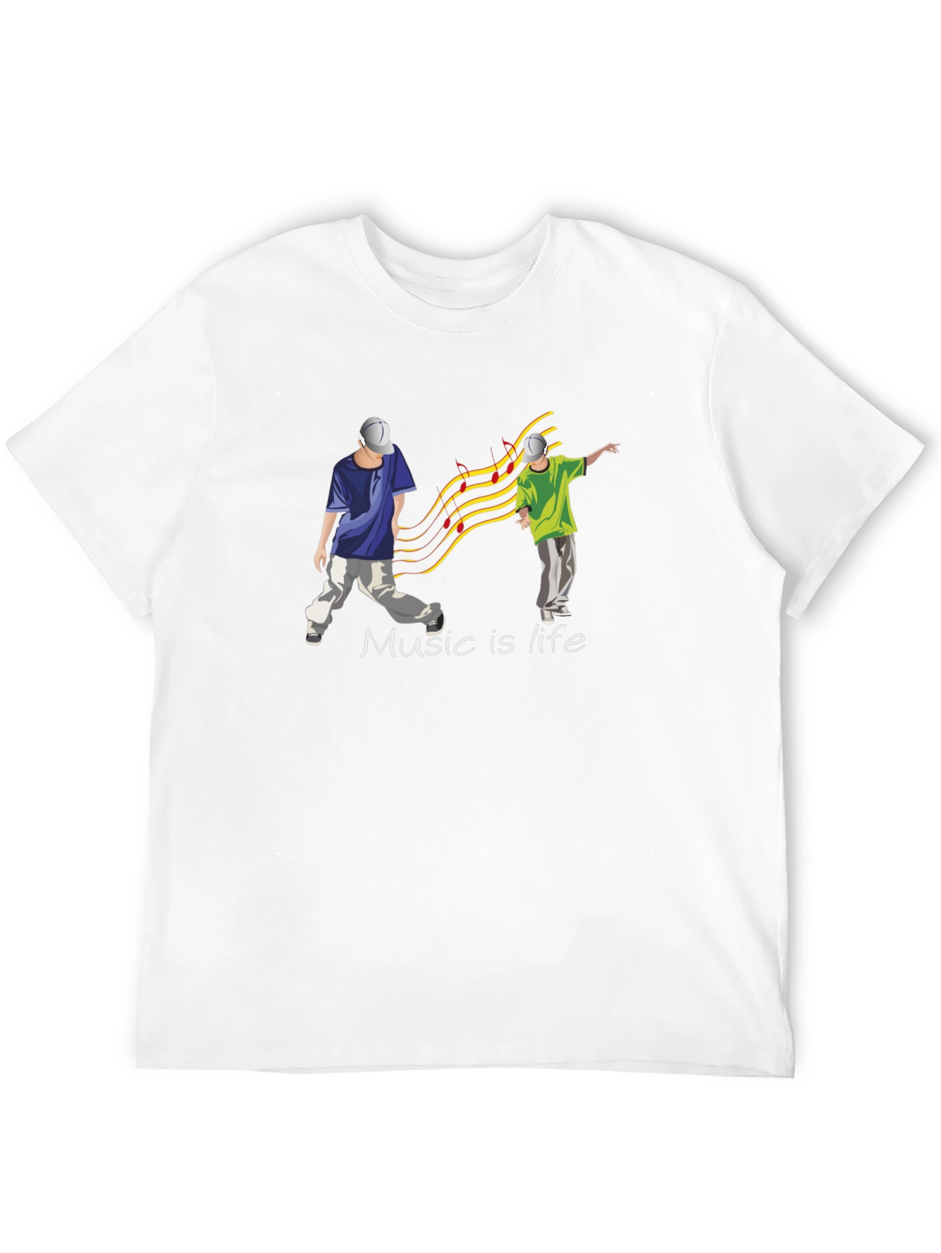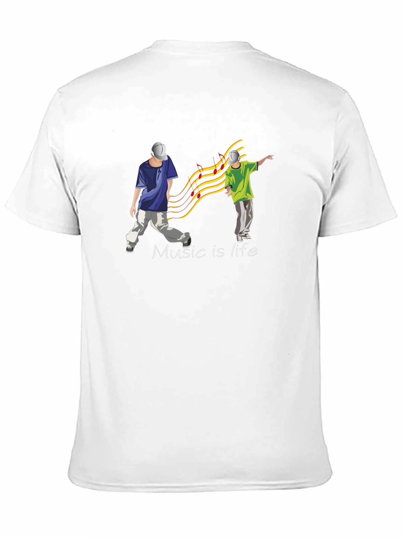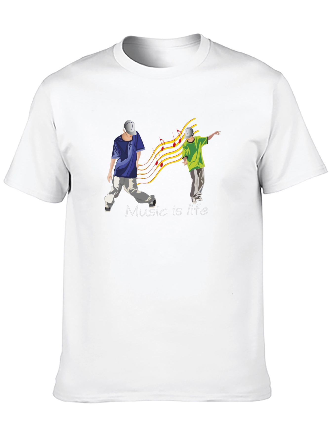 Express your passion for music with this stylish black T-shirt. The design features two figures dancing to the rhythm of music notes, accompanied by the inspiring phrase "Music is life." Made from comfortable fabric, this T-shirt is perfect for casual wear, concerts, or music events. Showcase your love for music with this eye-catching tee.