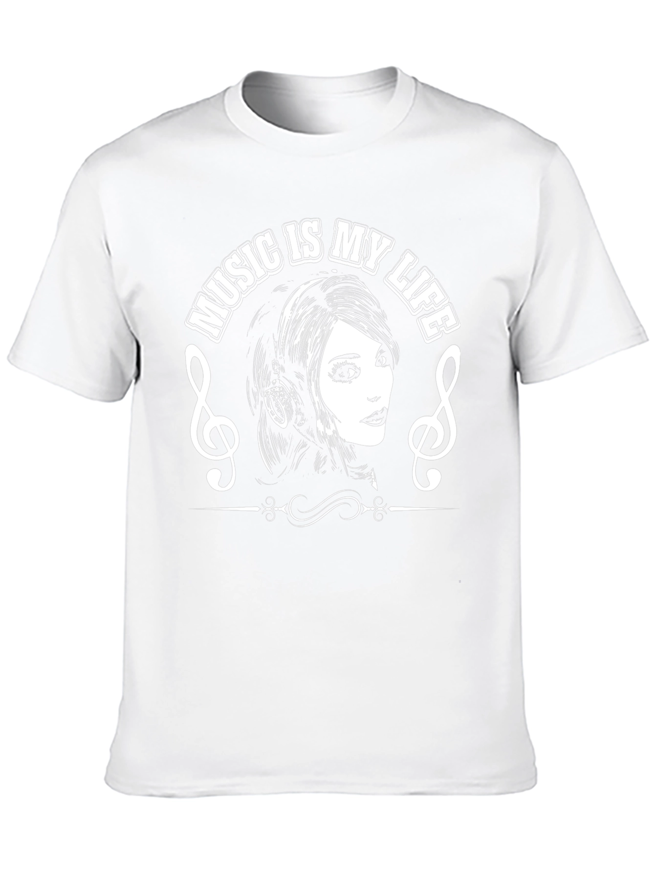 Rock your style with this eye-catching black T-shirt! Featuring a unique design with a woman wearing headphones surrounded by music notes and the phrase "Music is My Life", this tee is perfect for music lovers. The crisp white graphic pops against the black backdrop. Made from comfortable materials, this T-shirt is ideal for casual wear, concerts, or expressing your passion for music. Show off your love for music with this stylish and expressive T-shirt!