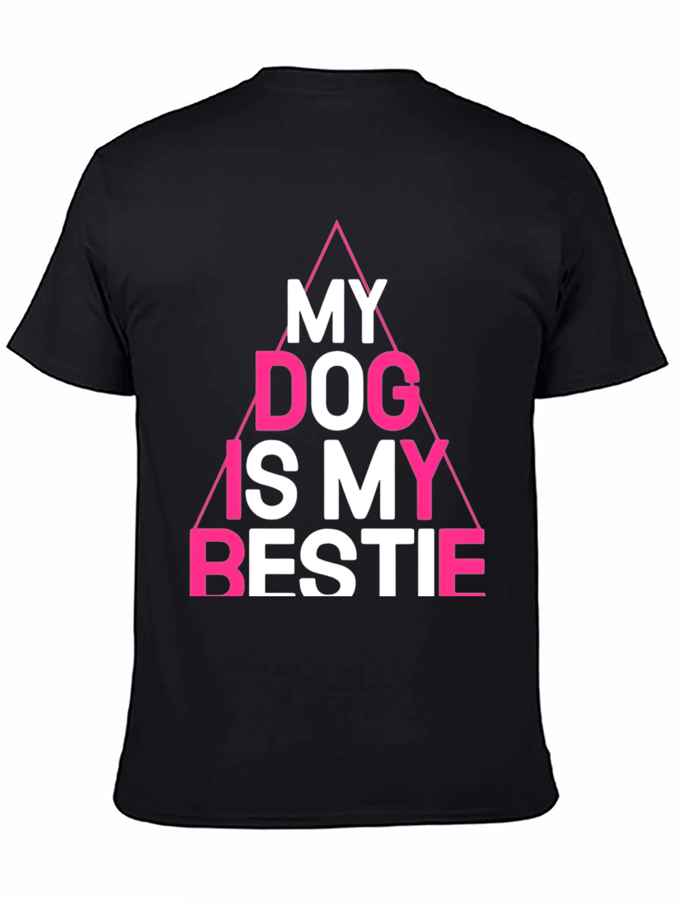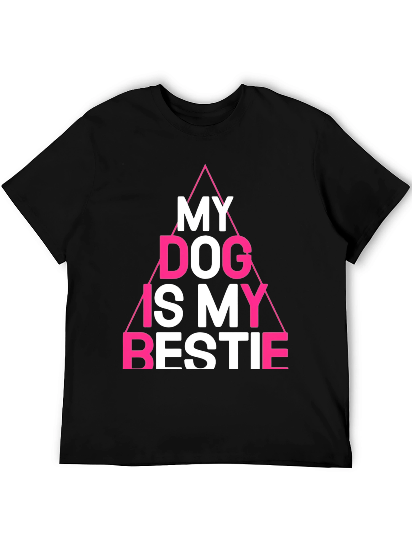 Show your love for your furry friend with this stylish black t-shirt. Featuring a bold graphic that reads 'MY DOG IS MY BESTIE' in a modern, eye-catching font, the design incorporates a cool triangular frame. The vibrant pink lettering adds a pop of color against the classic black backdrop. Made from what appears to be a comfortable and breathable fabric, this tee is perfect for casual outings, dog walks, or simply lounging at home. A great gift for dog lovers or a fun way to express your affection for your canine companion. Get yours today and wear your heart on your sleeve (or rather, your chest)!