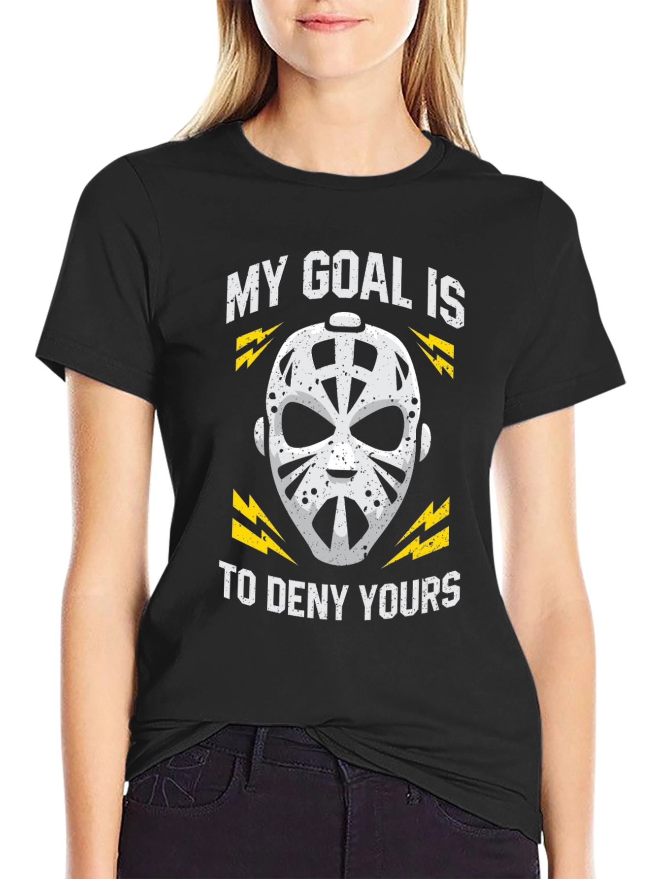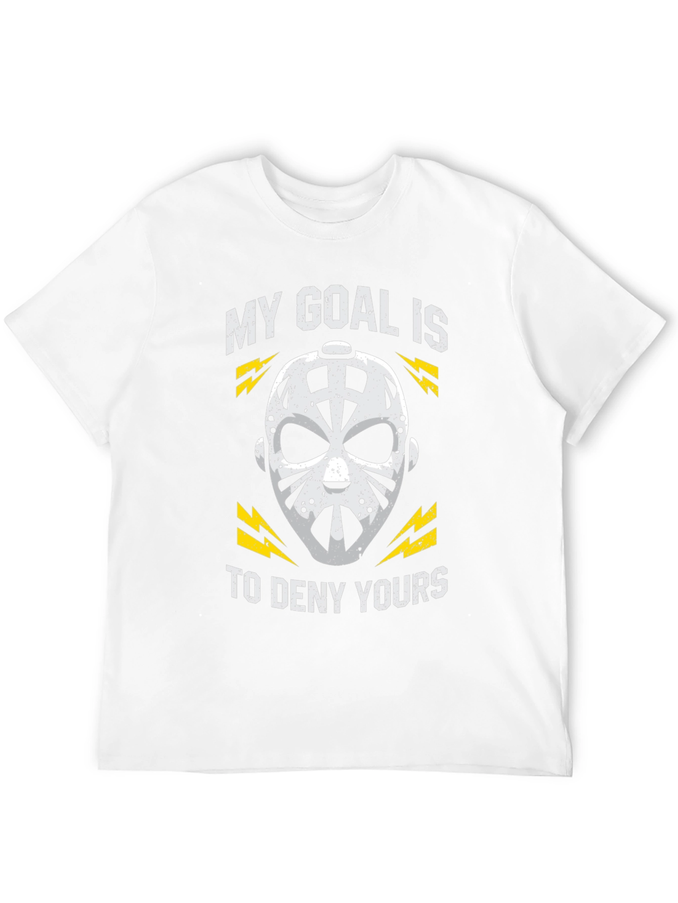 Score a win with this unique hockey-themed t-shirt. The bold graphic features a goalie mask, lightning bolts, and the phrase "MY GOAL IS TO DENY YOURS" making it perfect for hockey players and fans alike. Made from comfortable, breathable fabric, this tee is ideal for casual wear, game days, or hitting the ice. Show off your passion for the sport with this standout piece. Makes a great gift for hockey lovers!