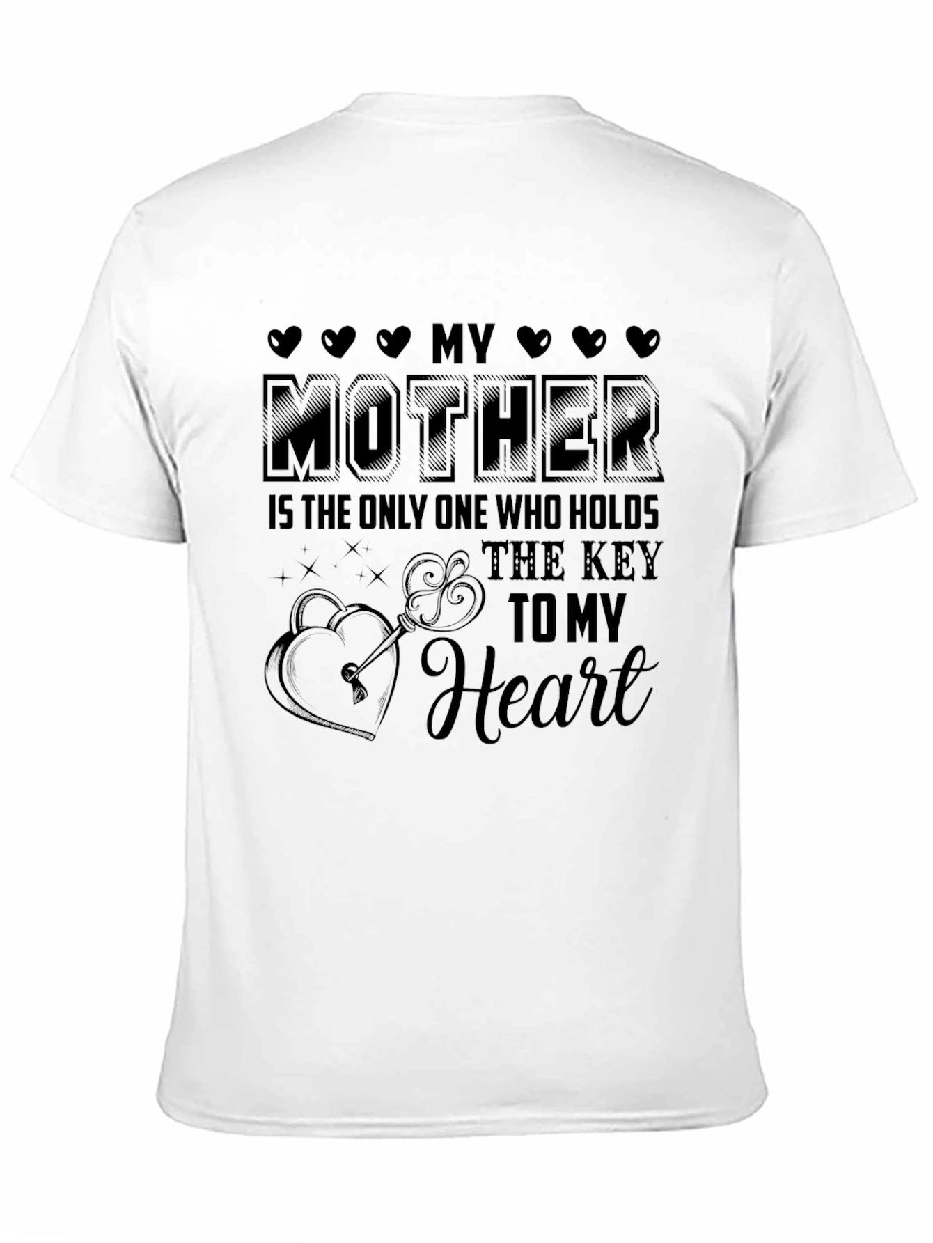 Show your love for mom with this stylish black t-shirt. This shirt features a unique design that reads 'My Mother is the only one who holds the key to my heart,' complete with heart accents. Made from comfortable materials, this t-shirt is perfect for casual wear or as a thoughtful gift. The dark color provides a sleek and versatile look, easily paired with jeans, shorts, or even dressed up with a jacket. Express your appreciation for the special bond with your mother by wearing this heartfelt and fashionable tee. Ideal for Mother's Day, birthdays, or just because!