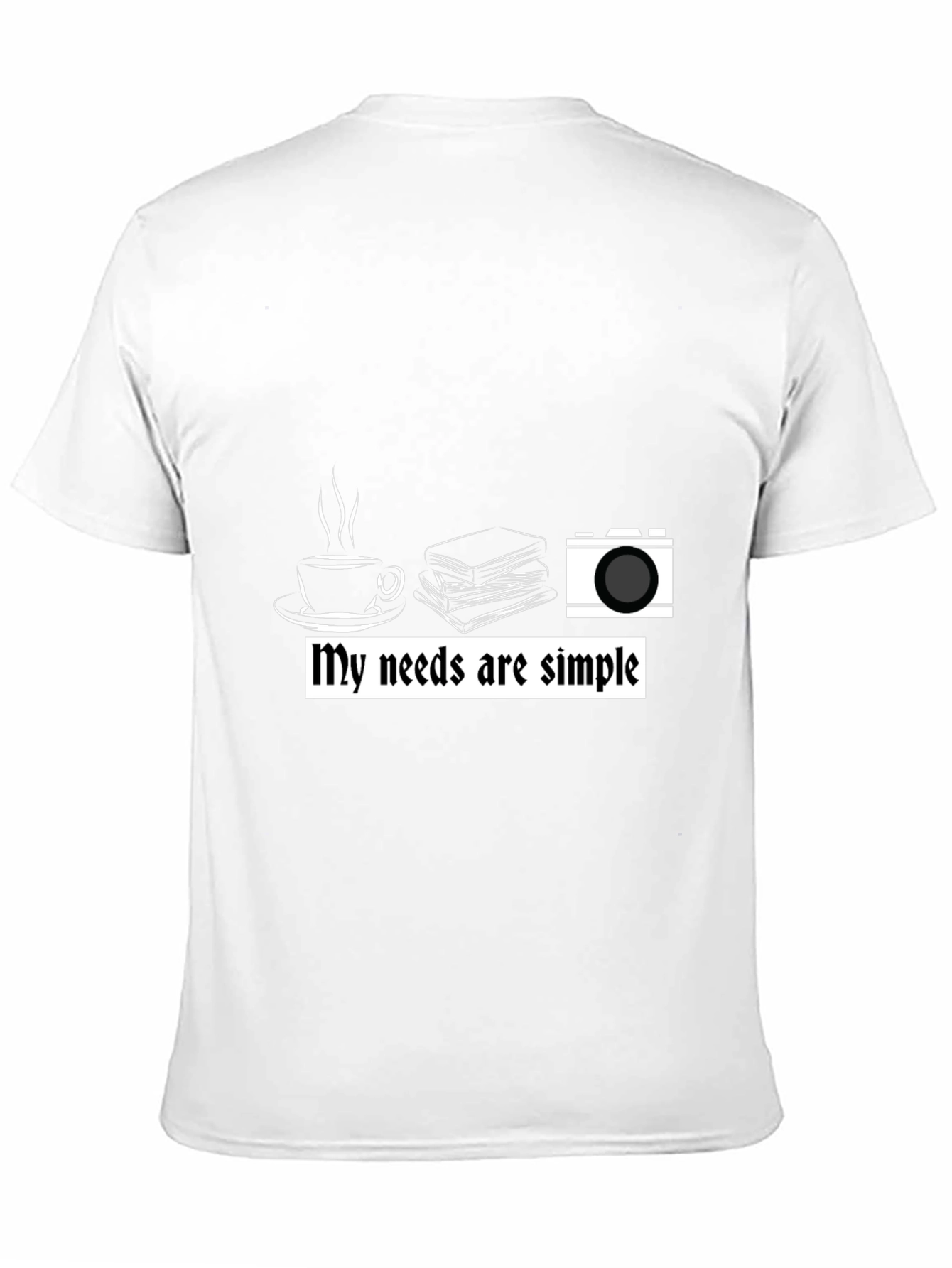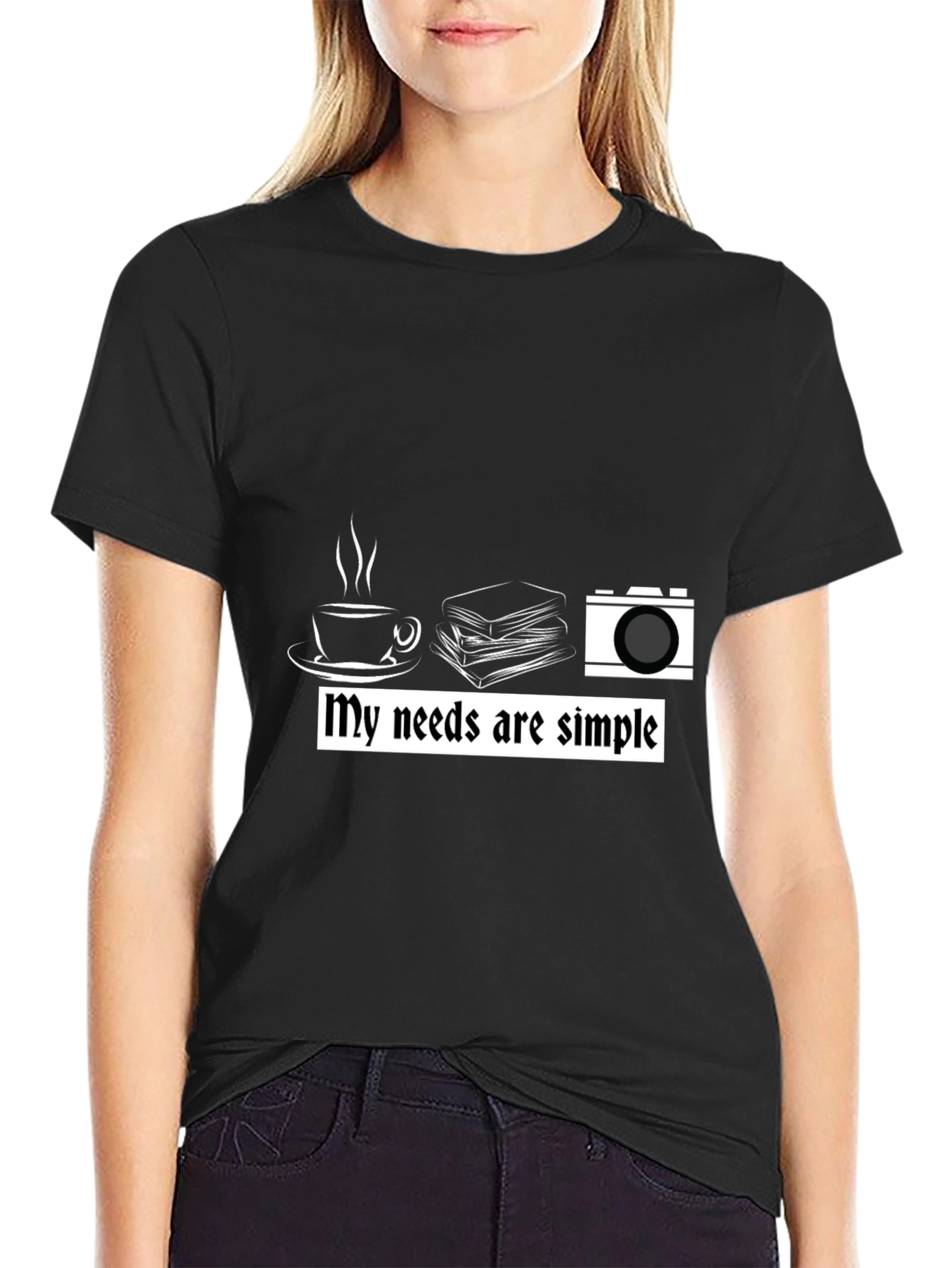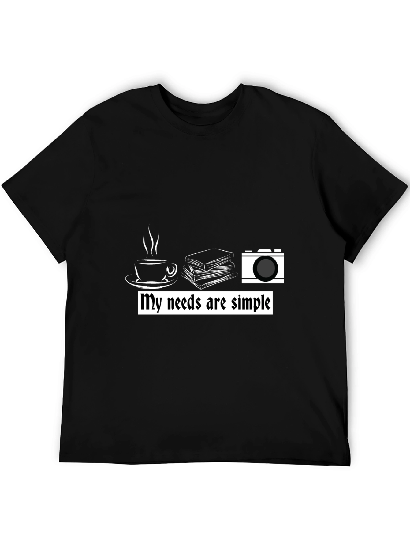 Express your simple pleasures with this stylish graphic t-shirt. The design features a coffee cup, stack of books, and a camera, accompanied by the witty text "My needs are simple." Made from a comfortable, breathable fabric, this black tee is perfect for everyday wear. Show off your love for coffee, reading, and photography in a fun and fashionable way. Ideal for casual outings, lounging at home, or as a gift for the person who appreciates the simple things in life.