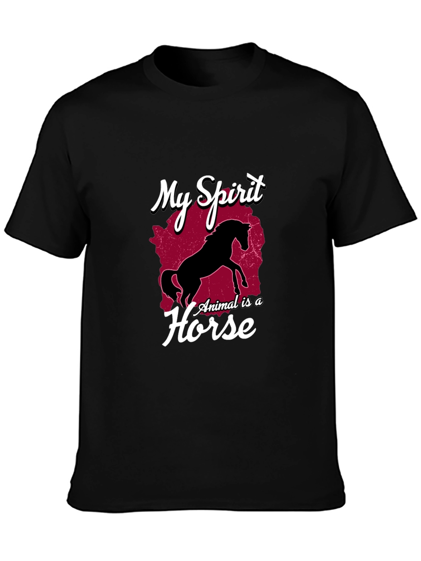 Show your love for horses with this stylish black graphic tee. This comfortable shirt features a bold design that declares "My Spirit Animal is a Horse", complete with a silhouette of a prancing horse against a rustic red backdrop. Perfect for casual wear, equestrian events, or as a gift for horse lovers. Made from soft, breathable fabric, this tee offers a comfortable fit and lasting durability. Express your passion and make a statement with this eye-catching tee!