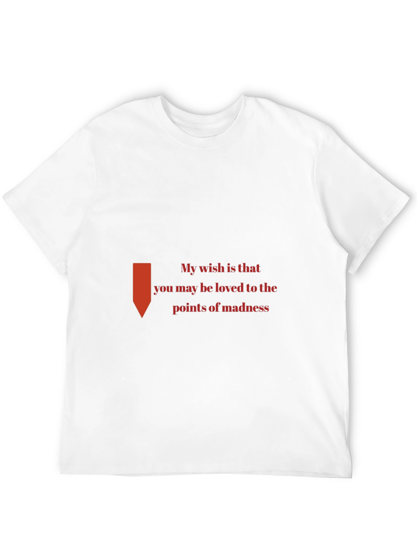Express your desires with this bold, black tee. Featuring a striking red graphic stating, "My wish is that you may be loved to the points of madness," this shirt makes a statement. The soft fabric provides all-day comfort, while the classic fit ensures a flattering silhouette. Perfect for casual outings, expressive events, or as a unique gift, this tee is a must-have for those who embrace passionate expression. Wear your heart on your sleeve—or rather, your chest—with this uniquely designed shirt. Show off your desire with this perfect graphic tee!