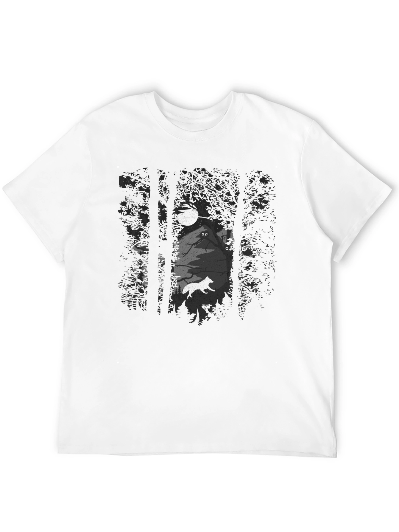 Embrace the allure of the night with this captivating Mystic Forest Graphic Tee. Featuring a striking graphic design, this black tee showcases a serene forest scene with a mysterious atmosphere. A lone white fox leaps through the trees, illuminated by moonlight, while subtle eyes watch from the shadows. Crafted from a comfortable cotton blend, this t-shirt offers both style and comfort. The unique design makes it a standout piece, perfect for casual wear, outdoor adventures, or expressing your love for nature and fantasy. Let this tee add a touch of enigma to your wardrobe.
