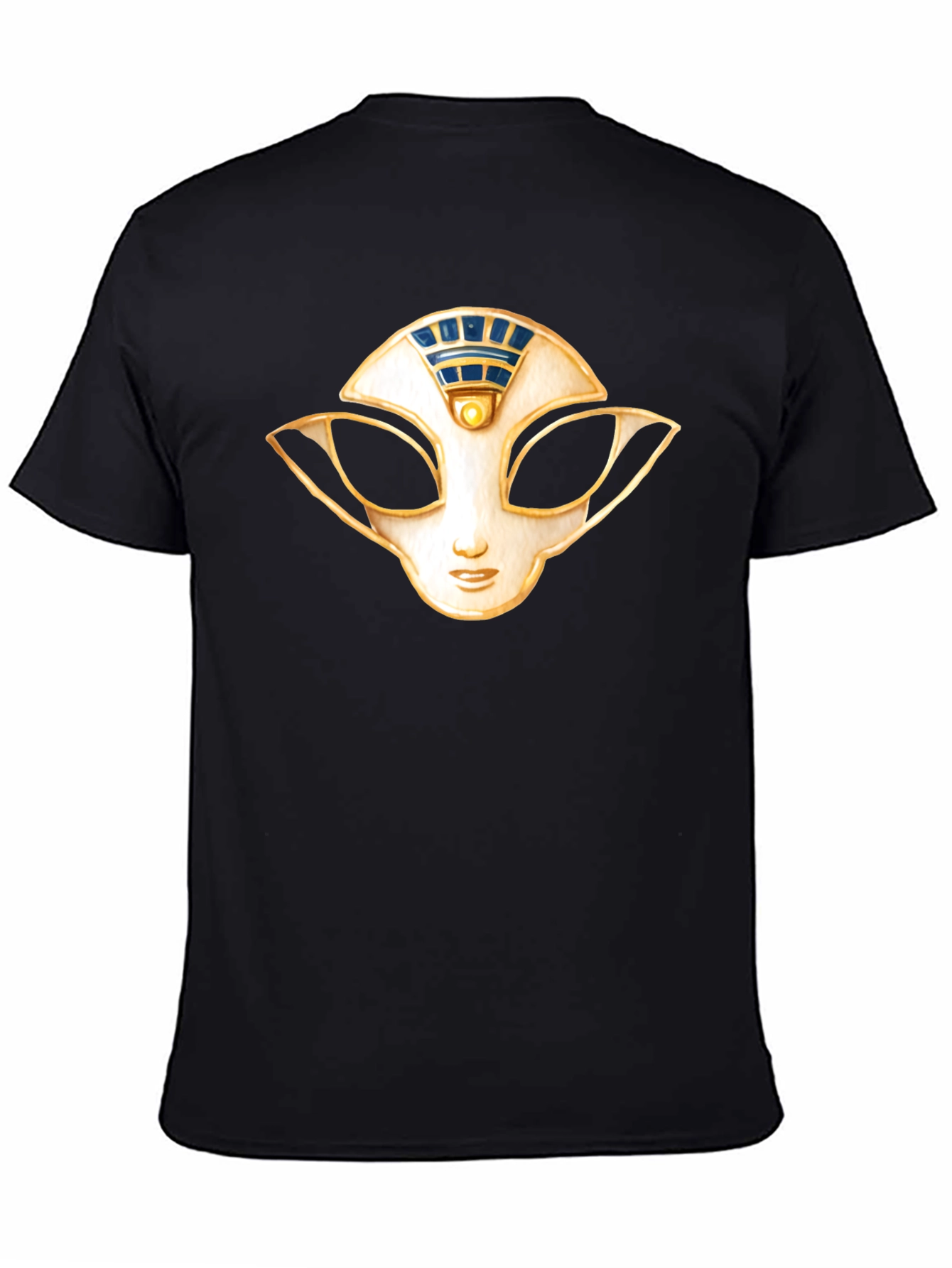 This striking black t-shirt features a captivating graphic of an Egyptian-style mask. The mask, rendered in tones of ivory and gold with blue accents, offers an aura of mystery and ancient allure. Crafted from what appears to be soft cotton, this tee promises comfort and breathability. The design is eye-catching yet versatile, suitable for casual outings, concerts, or adding a unique touch to your everyday wardrobe. Make a statement with this captivating tee. Machine washable.