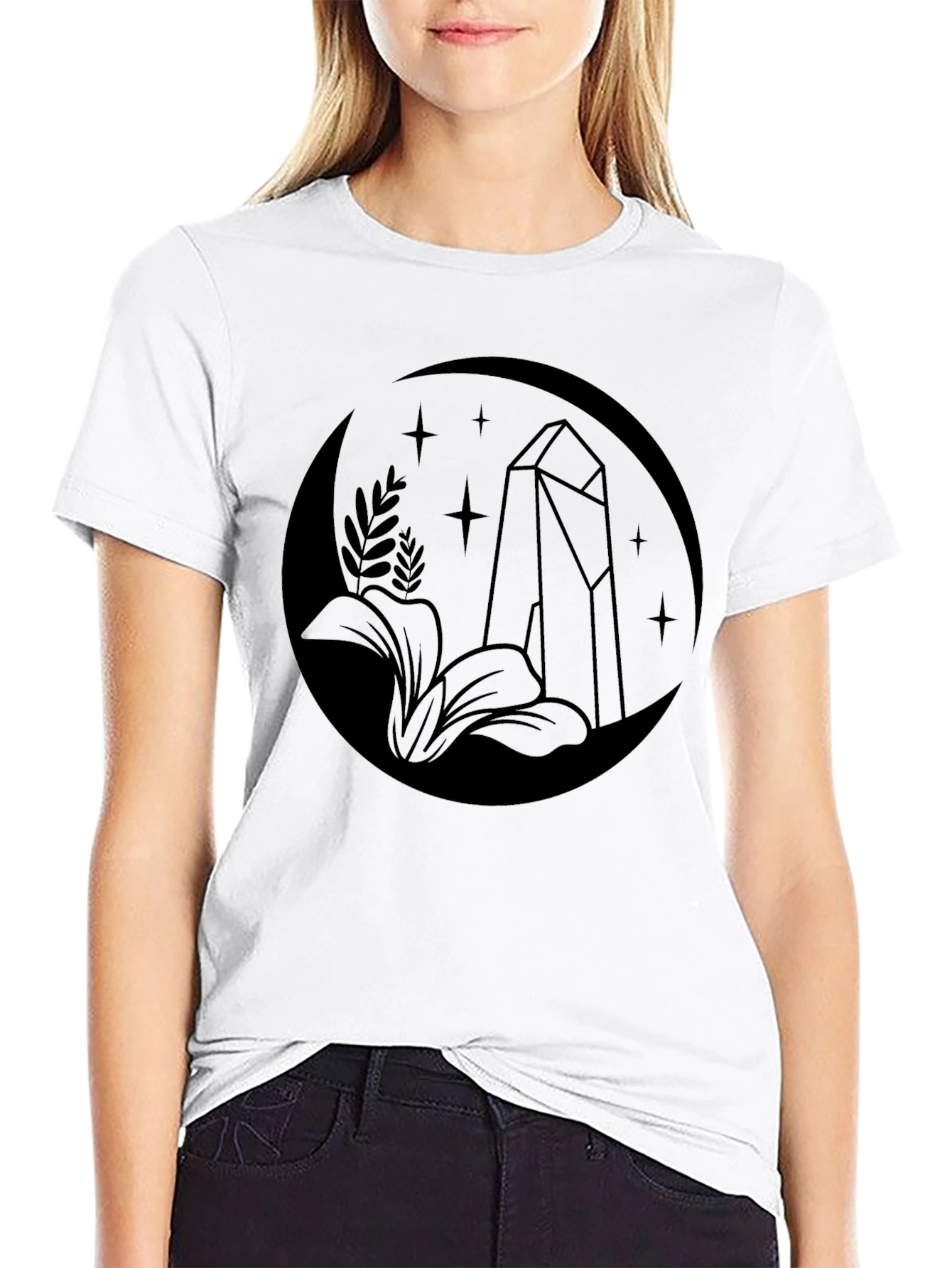 Embrace celestial vibes with this stylish black graphic tee. This shirt features a crescent moon design encompassing a crystal formation, foliage, and subtle star accents. Crafted from a soft, comfortable fabric, this tee offers a relaxed fit perfect for everyday wear. The unique graphic design makes it a standout piece, ideal for adding a touch of mystique to your casual style. Pair it with jeans for a relaxed look, or dress it up with a jacket for an edgy ensemble. This shirt is a must-have for anyone who loves nature-inspired fashion.