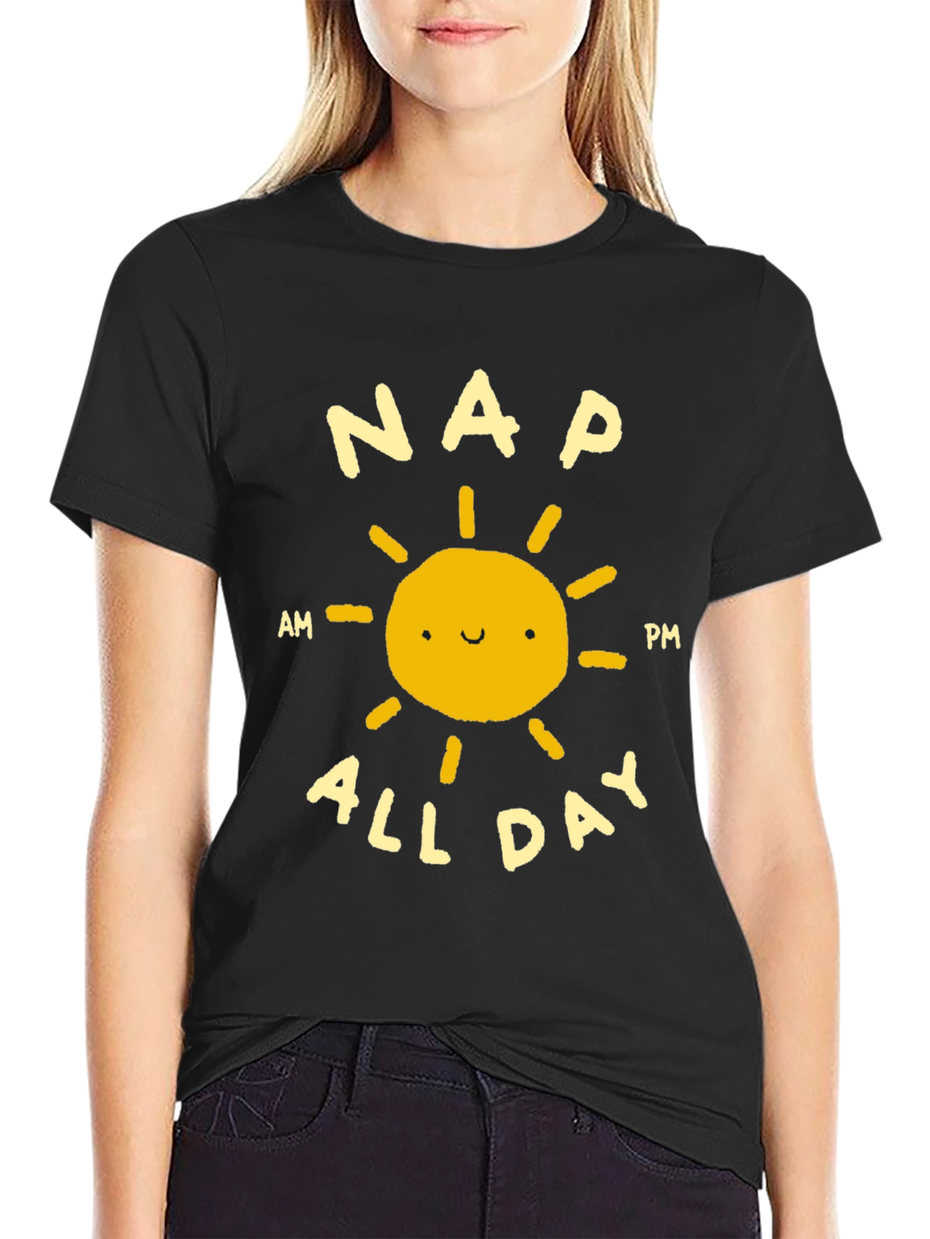 This comfy black t-shirt features a fun and playful design, perfect for those who love to nap. The print shows a cheerful yellow sun with 'NAP ALL DAY' written around it, with AM and PM noted on either side, emphasizing the desire for all-day relaxation. Made from a soft-looking fabric, this tee appears breathable and comfortable, ideal for casual wear or lounging at home. Show off your love for sleep with this unique and eye-catching t-shirt! Great for gifting to the sleep-enthusiast in your life.