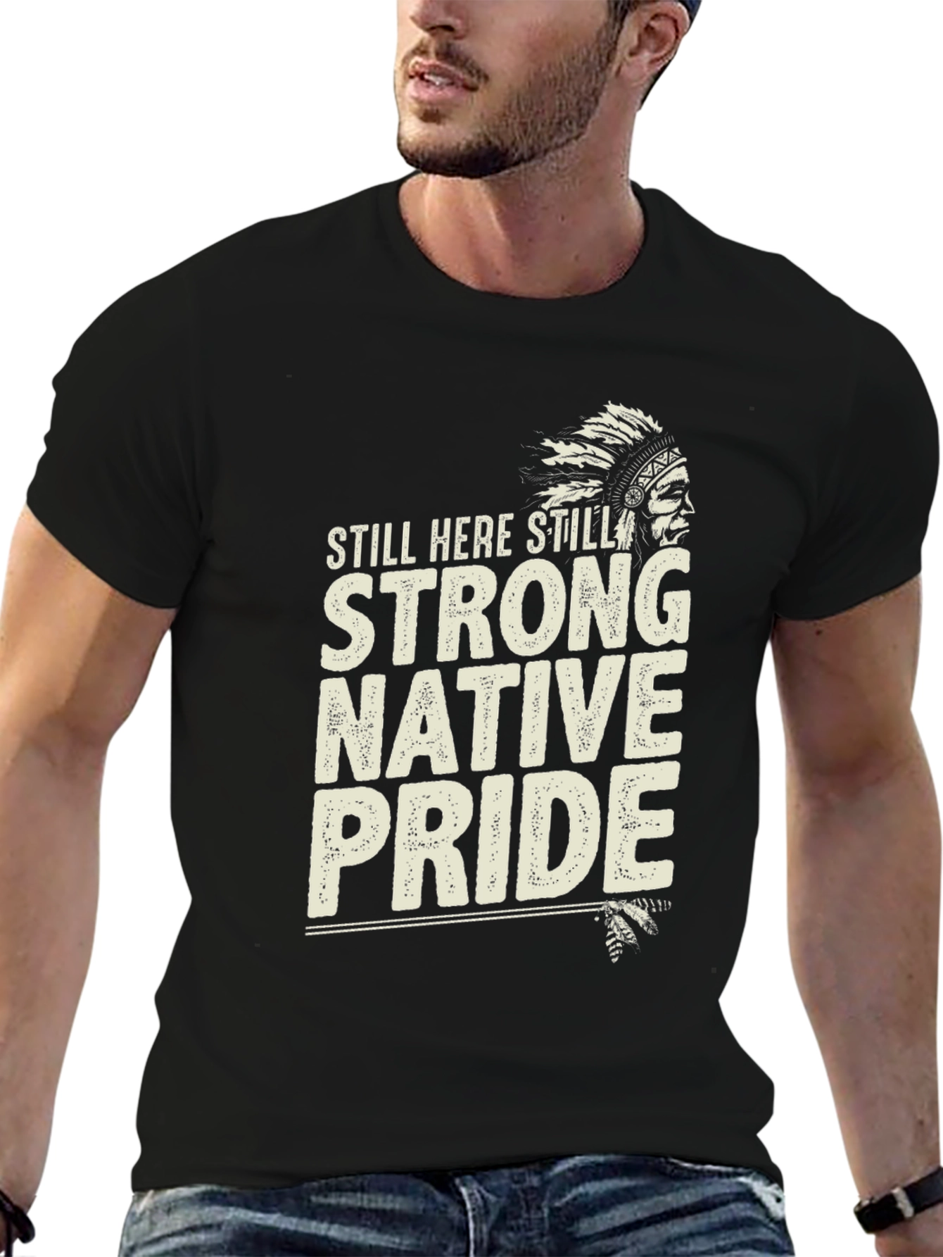 Show your Native American pride with this bold black t-shirt. The design features the powerful words "Still Here Still Strong Native Pride" in a distressed, vintage-style font, accompanied by a detailed graphic of a Native American headdress. Made from a comfortable fabric, this tee is perfect for everyday wear, cultural events, or as a statement piece. Embrace your heritage and make a statement with this unique and eye-catching t-shirt.