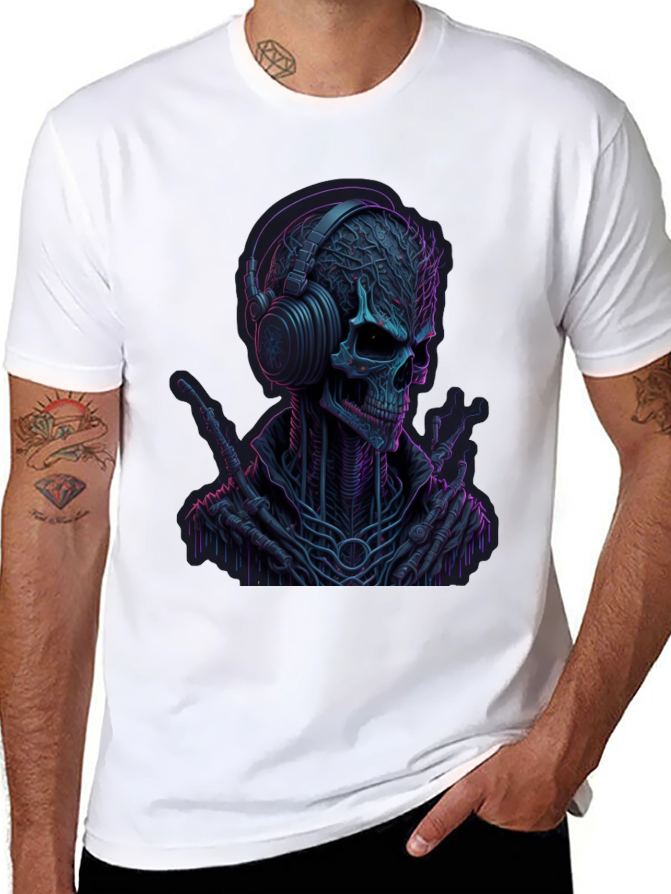 Unleash your inner darkwave with this unique graphic tee. Featuring a stylized neon skull wearing headphones, this shirt is sure to turn heads. The design pops with vibrant blue and purple hues against the classic black cotton. The detailed print showcases a futuristic, almost cybernetic skull, giving it a edgy and modern feel. Perfect for music lovers, gamers, or anyone who appreciates unique and bold fashion. Wear it casually with jeans or dress it up for a night out. Express your individuality and make a statement with this eye-catching tee.