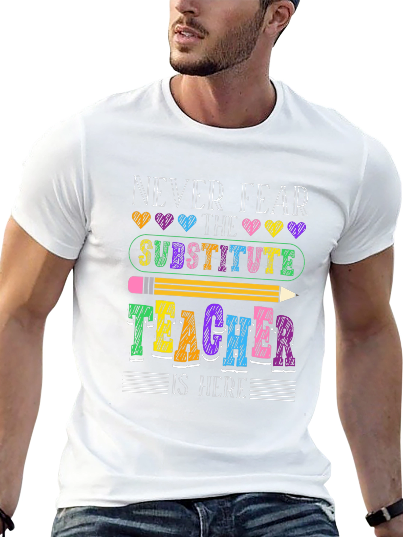 Show your appreciation for substitute teachers with this fun graphic t-shirt! The design features the text "Never Fear The Substitute Teacher Is Here" in a playful, colorful font, adorned with hearts and a pencil graphic. Made from a comfortable black fabric, this tee is perfect for casual wear, school events, or as a thoughtful gift for your favorite substitute teacher. Celebrate the heroes who step in to make a difference with this stylish and spirited shirt!
