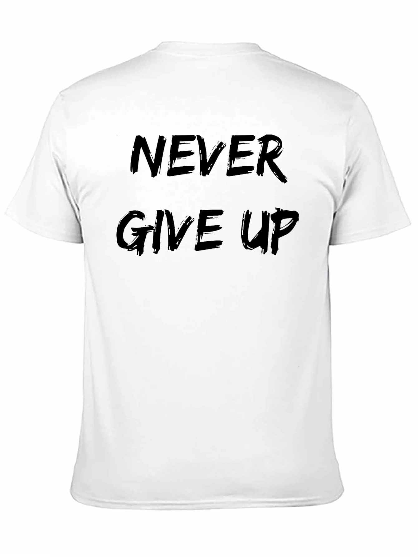 This classic black t-shirt makes a bold statement with the inspiring words "Never Give Up" emblazoned across the chest. The print is a darker hue of black, creating a subtle yet powerful design. Crafted from what appears to be a soft and breathable cotton blend, this tee offers all-day comfort and style. Its versatile design makes it perfect for workouts, casual outings, or simply lounging at home. Show off your resilience and positive attitude with this motivational t-shirt. A great gift for anyone needing a boost of encouragement.