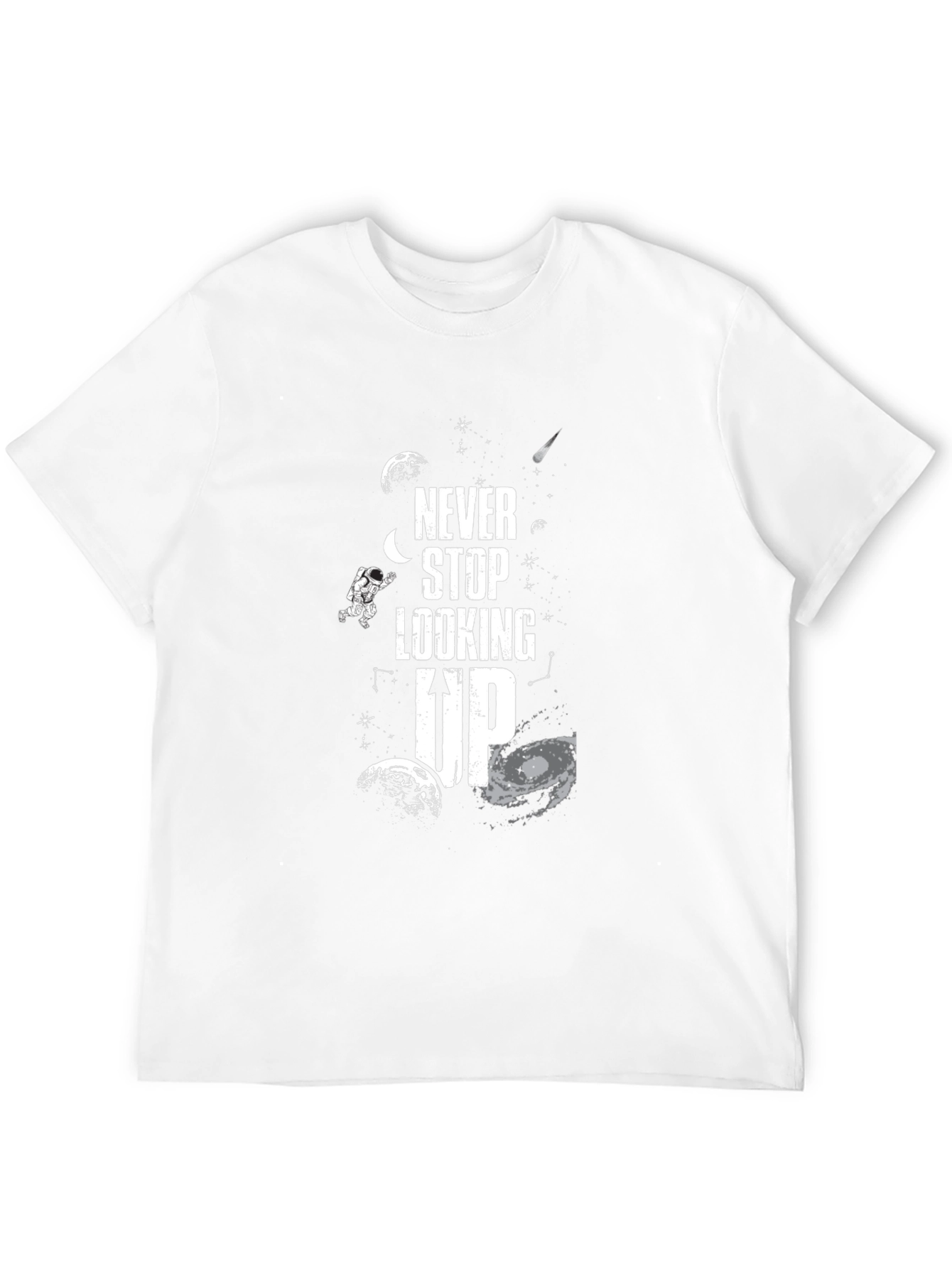 Explore the cosmos in style with this eye-catching black graphic tee! Featuring a bold 'Never Stop Looking Up' design, this shirt is perfect for stargazers, dreamers, and anyone who loves the beauty of space. The graphic includes planets, stars, an astronaut, and a galaxy, creating a visually stunning and unique look. Made from comfortable, breathable fabric, this tee is ideal for everyday wear or a casual night out. Show off your passion for the universe with this must-have statement piece. Get yours today and inspire others to keep looking up!