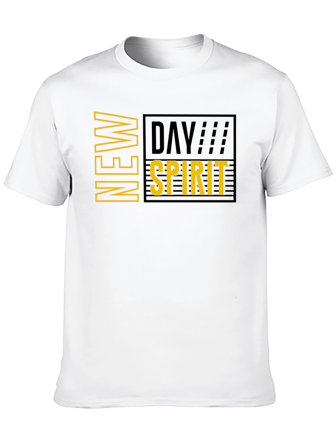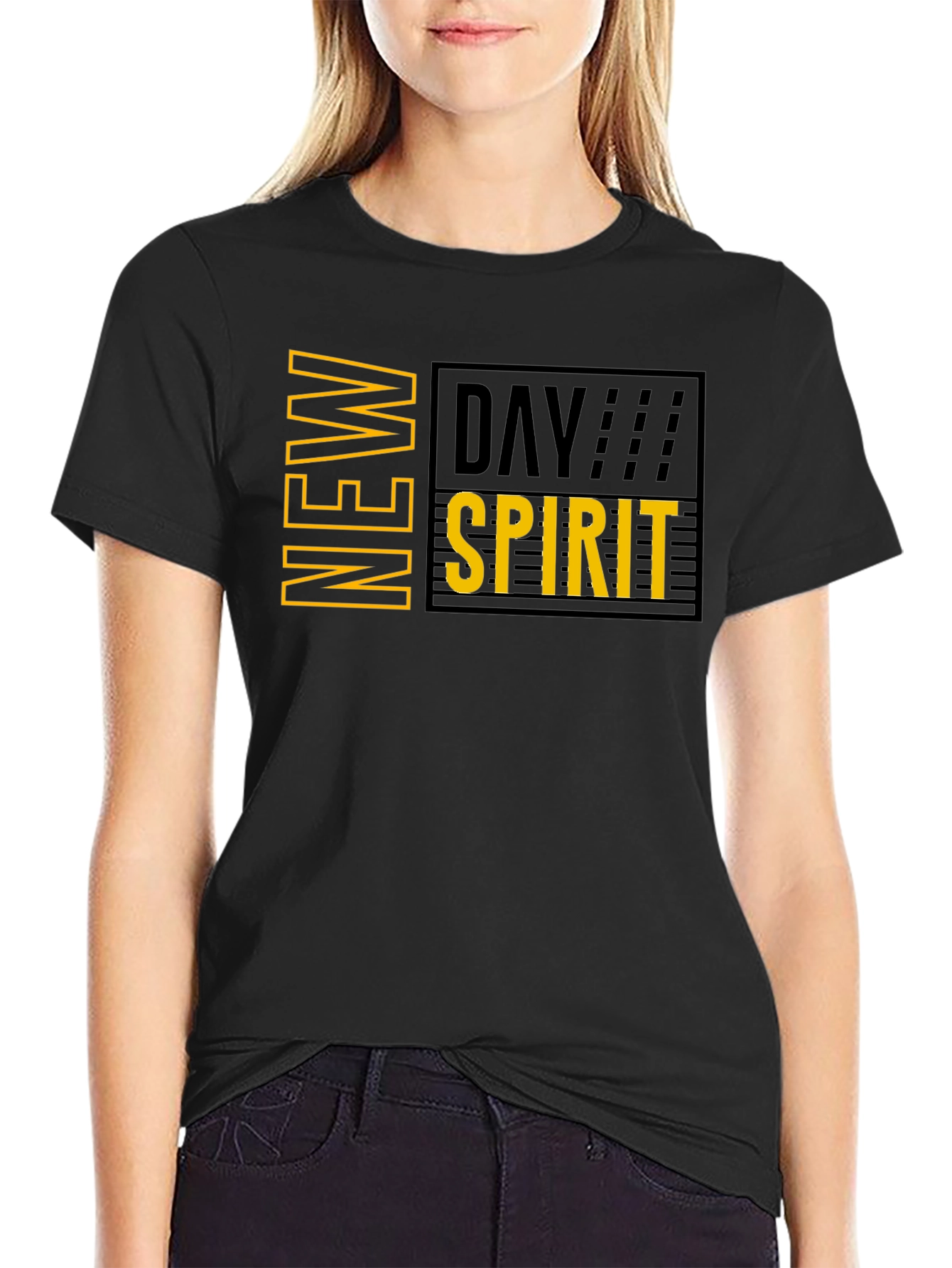Elevate your everyday style with this striking black t-shirt. Featuring a bold "New Day Spirit" graphic print, it's the perfect blend of modern design and comfort. The high-quality print combines contrasting black and gold tones for an eye-catching statement. Made from soft, breathable fabric, this tee ensures all-day comfort. Ideal for casual outings, workouts, or relaxed weekends, this versatile t-shirt pairs effortlessly with jeans, shorts, or joggers. Make a statement and showcase your vibrant spirit with this must-have wardrobe essential.