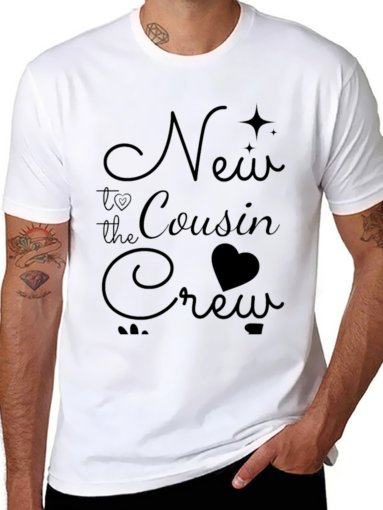 Show off your family pride with this stylish black t-shirt. The design features the phrase "New to the Cousin Crew" in an elegant script font, complemented by a heart graphic. Made from a soft, comfortable fabric, this tee is perfect for family gatherings, casual outings, or everyday wear. Its classic fit ensures a flattering look for all. Celebrate the joy of kinship with this charming t-shirt!