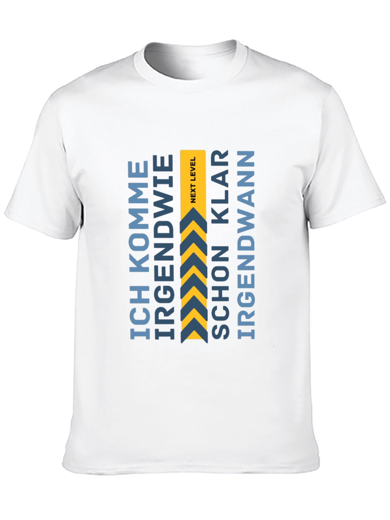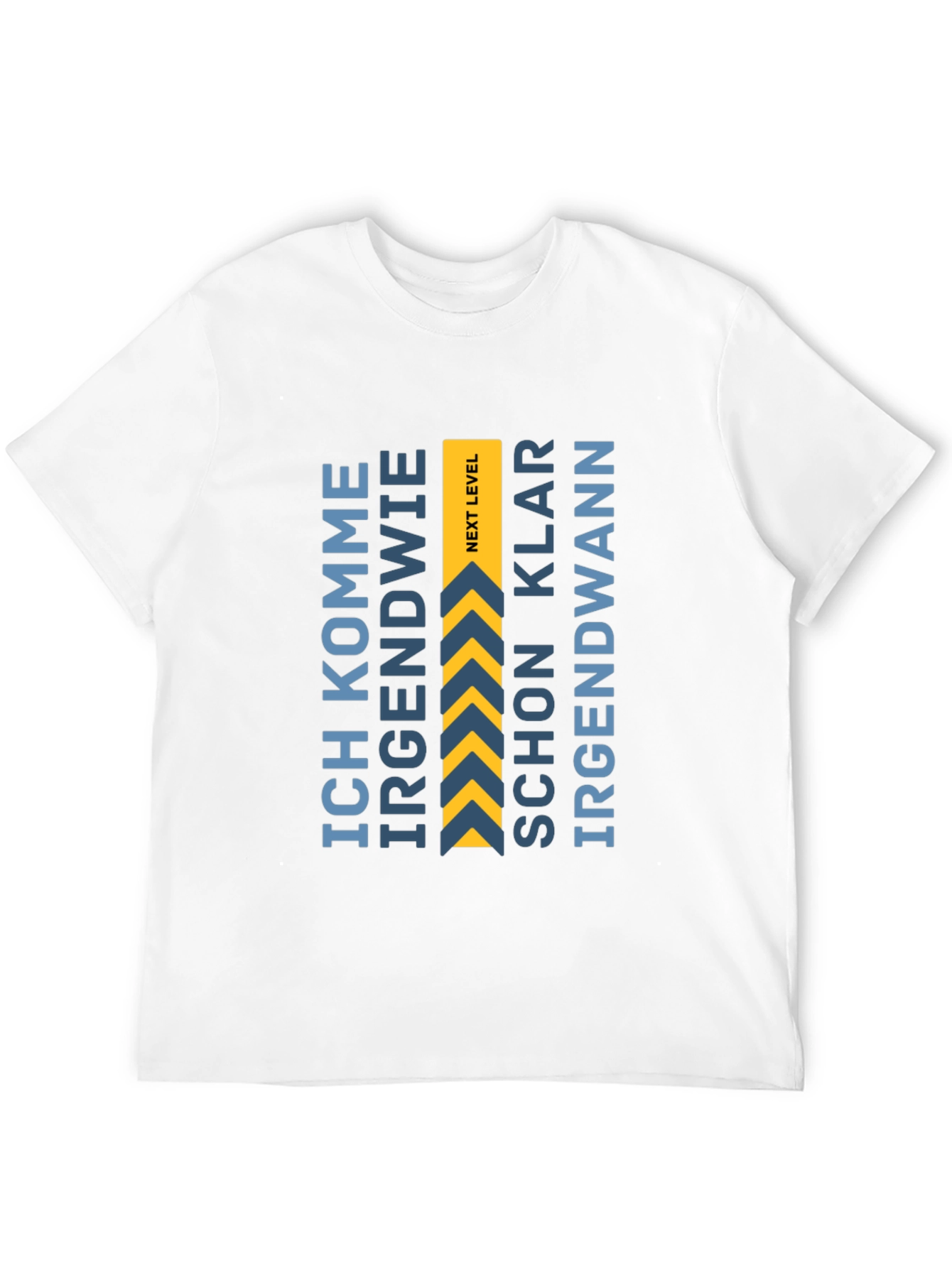 This black t-shirt features a unique and eye-catching design. Down the middle is a column with yellow and blue arrows with a yellow rectangle that says, "NEXT LEVEL". On either side of the design, is a German phrase written in vertical alignment. This soft and comfortable tee is perfect for casual wear, showcasing a blend of modern design and a touch of German culture. Ideal for everyday wear, or as a conversation starter.