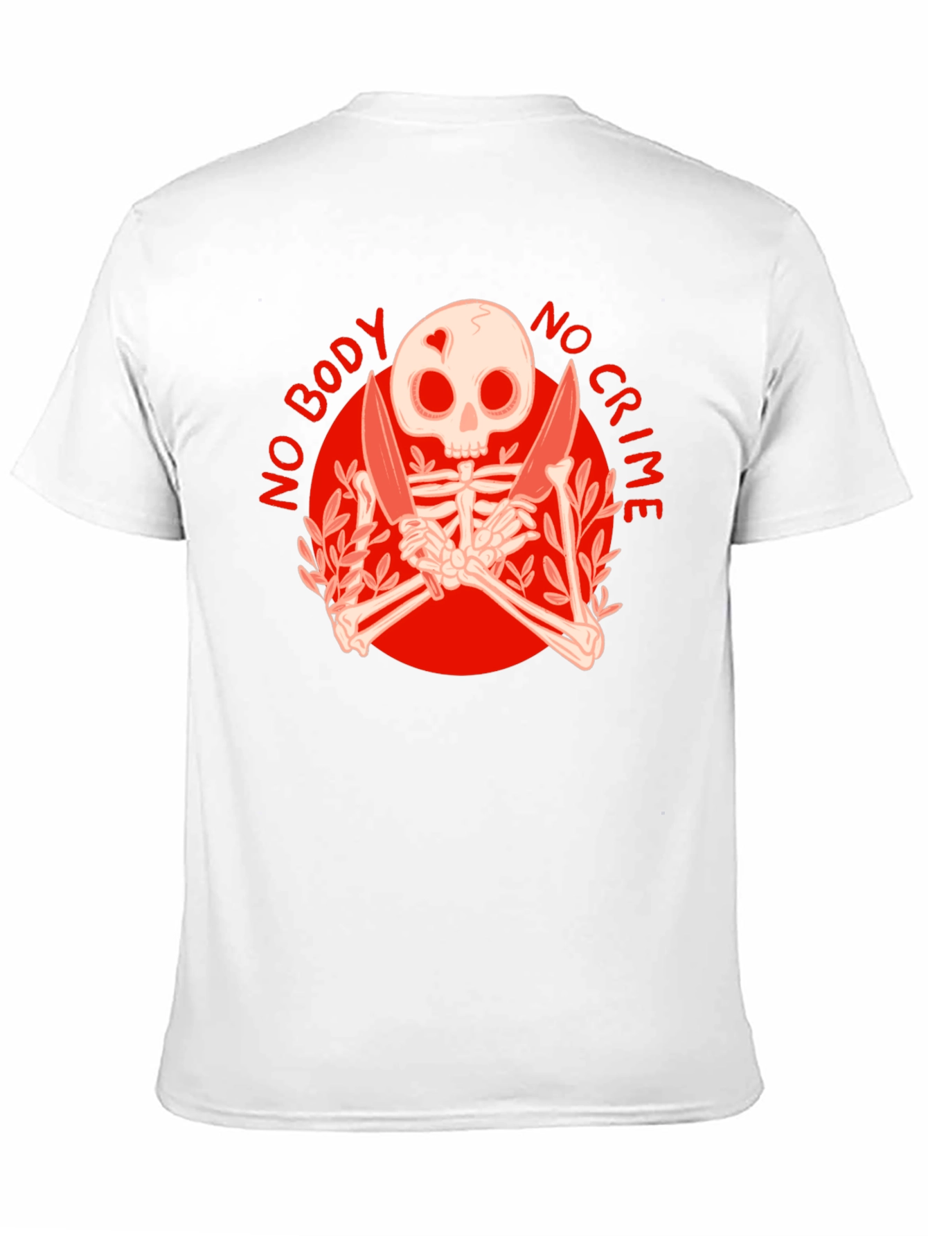 Make a statement with this edgy black t-shirt featuring a unique graphic design. The tee showcases a skeleton holding crossed knives against a vibrant red circle, surrounded by the phrase 'No Body No Crime'. The design incorporates small details such as a heart on the skull adding a touch of dark humor. Crafted from comfortable, breathable fabric, this tee is perfect for everyday wear or to show off your unique style. Pair it with jeans or shorts for a casual look. Ideal for anyone who loves alternative fashion and wants to express their personality.
