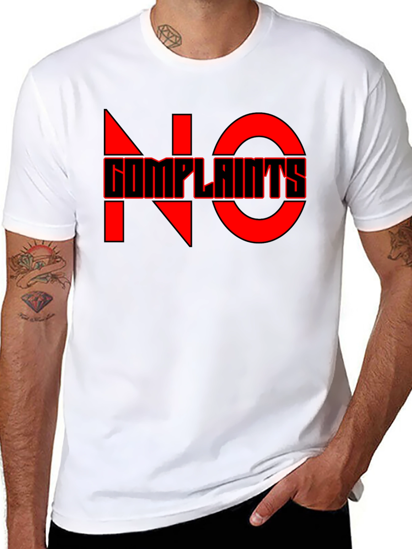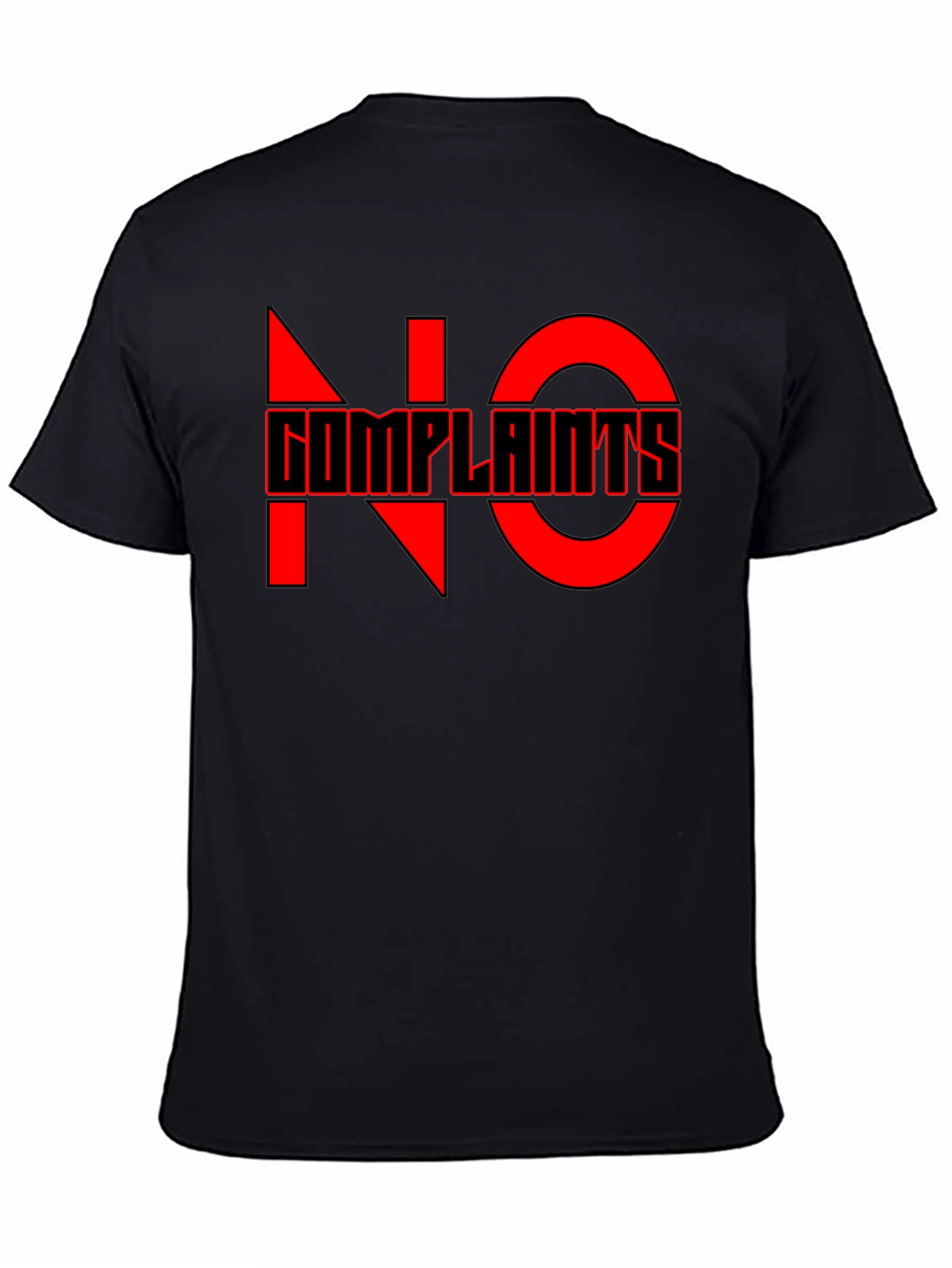 This black graphic tee features a bold, red "NO COMPLAINTS" design. The upper text is stylized with blocky font. Made from a comfortable-looking fabric, this shirt is perfect for casual wear. The shirt's design is eye-catching, making it ideal for everyday use. Dress it up with jeans and a jacket or wear it as a casual statement piece. The unique and memorable text adds a fun edge to any outfit. This tee is a must-have for anyone looking to express their personality through fashion.