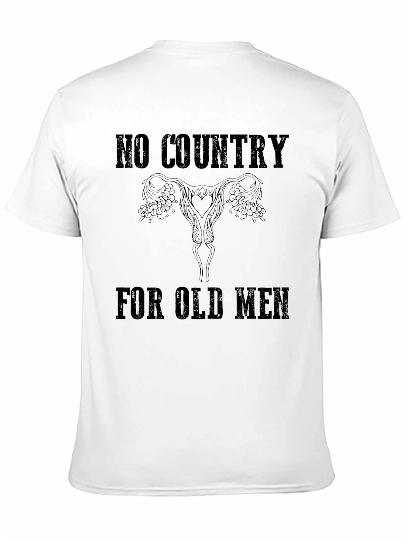 Show your support with this bold black graphic t-shirt. This edgy tee features the text "No Country For Old Men" above and below a stylized illustration of a uterus, making a powerful statement. Crafted from a soft, comfortable fabric, this shirt is perfect for everyday wear. Its classic fit and durable design make it a versatile addition to any wardrobe. Ideal for rallies, casual outings, or as a conversation starter, this tee combines comfort and conviction. Wear your beliefs with pride and stand out from the crowd with this unique and expressive t-shirt.