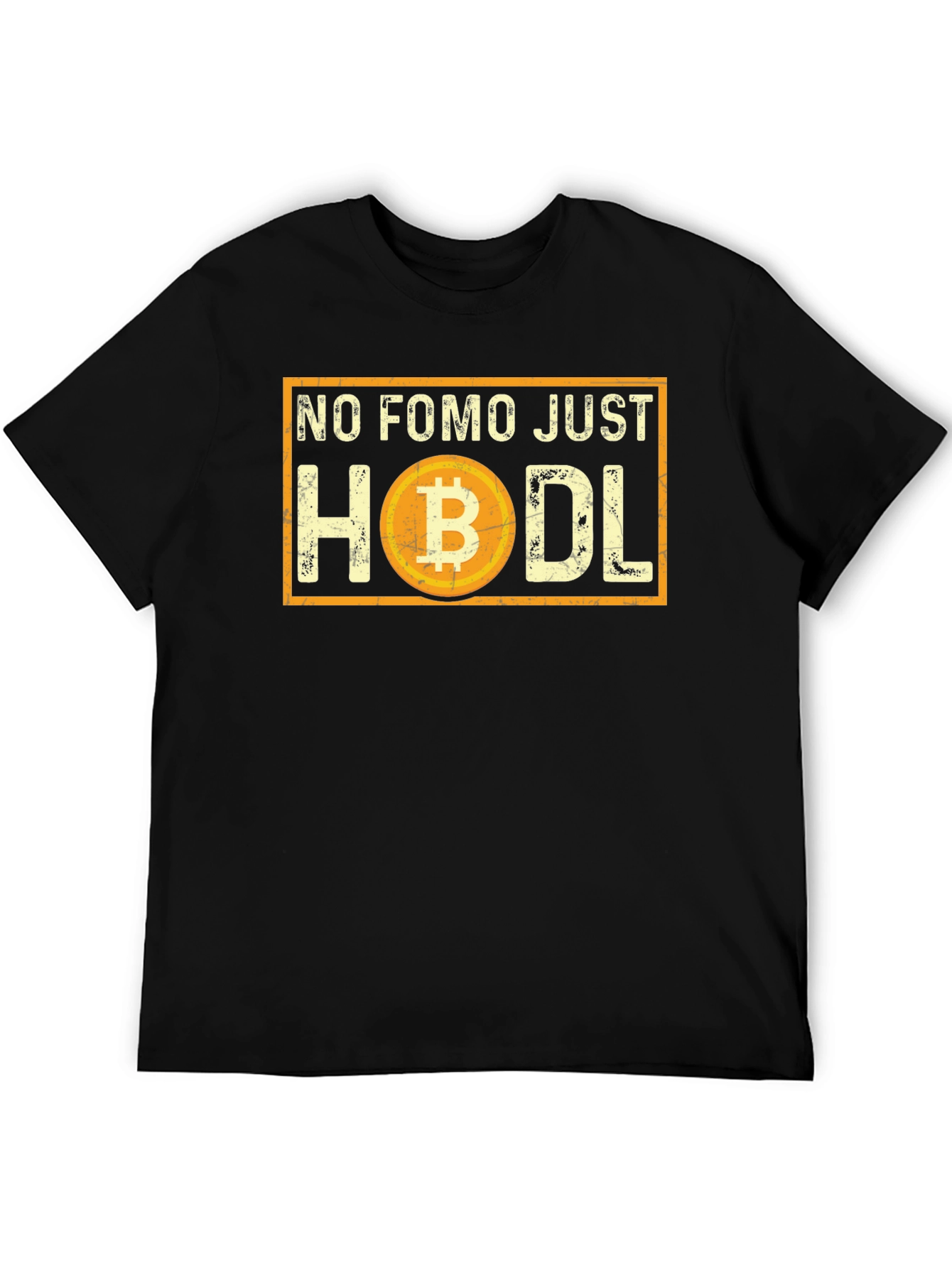 This stylish black t-shirt features a bold graphic print with the phrase "NO FOMO JUST HODL." The word "HODL" is uniquely designed with a Bitcoin symbol at its center, making it perfect for cryptocurrency enthusiasts. The design has a distressed, vintage look with a yellow outline, adding to its appeal. Made from a soft and comfortable fabric, this tee is great for casual wear, crypto meetups, or as a statement piece. Show off your Bitcoin pride and keep a cool head in the volatile crypto market. This eye-catching shirt is sure to spark conversations and add a touch of humor to your wardrobe. Grab yours today and represent the HODL community!