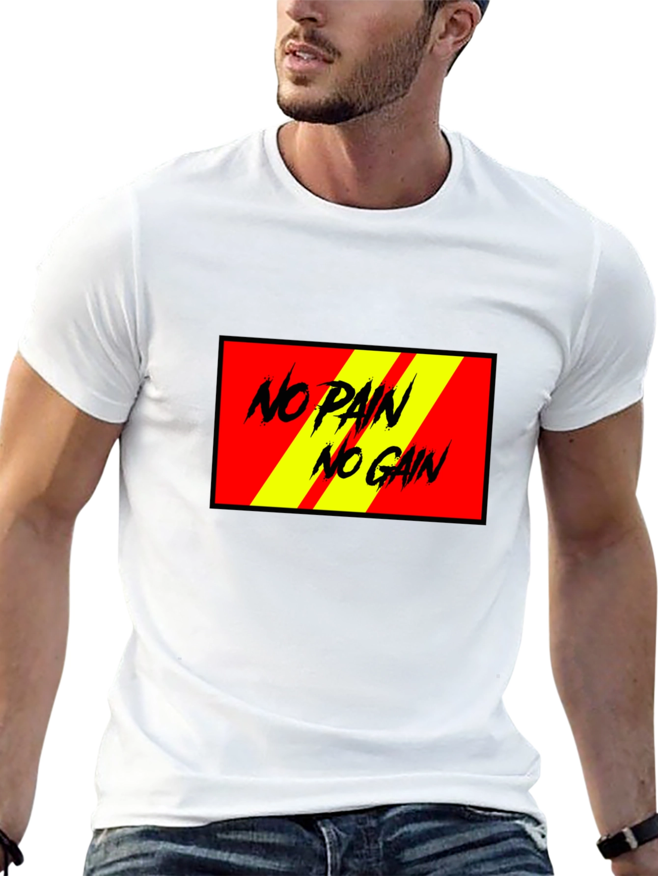 Elevate your workout wardrobe with this striking black t-shirt. Featuring a bold graphic print emblazoned across the chest, the design incorporates vibrant red and yellow stripes. The text "NO PAIN NO GAIN" is displayed for maximum motivation. Crafted from comfortable fabric, this tee is breathable, allowing you to stay cool and comfortable during any activity. Whether you're hitting the gym, going for a run, or just running errands, this t-shirt is the perfect choice. Make a statement and push your limits with this essential piece.
